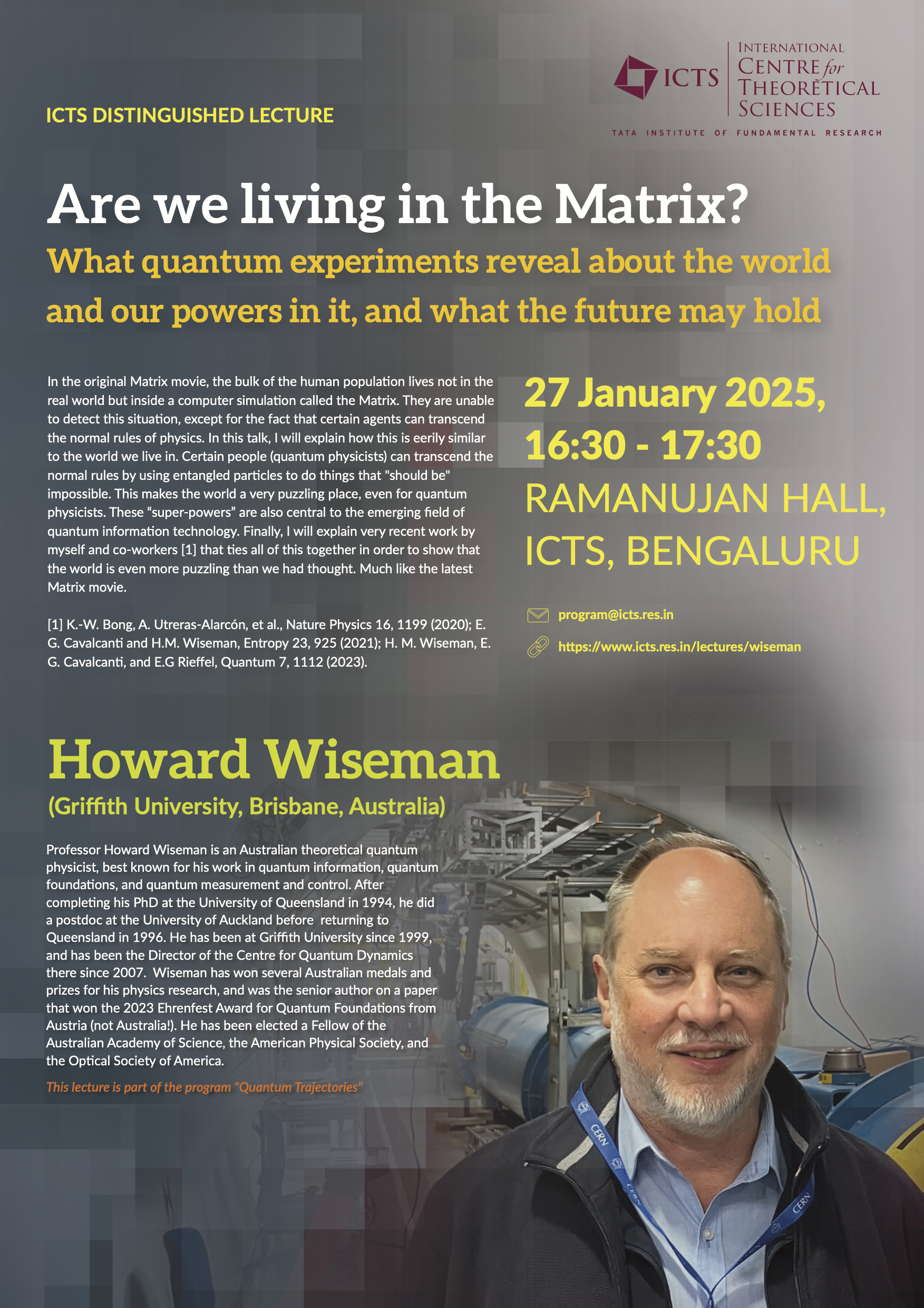About the speaker: Professor Howard Wiseman is an Australian theoretical quantum physicist, best known for his work in quantum information, quantum foundations, and quantum measurement and control. After completing his PhD at the University of Queensland in 1994, he did a postdoc at the University of Auckland before returning to Queensland in 1996. He has been at Griffith University since 1999, and has been the Director of the Centre for Quantum Dynamics there since 2007. Wiseman has won several Australian medals and prizes for his physics research, and was the senior author on a paper that won the 2023 Ehrenfest Award for Quantum Foundations from Austria (not Australia!). He has been elected a Fellow of the Australian Academy of Science, the American Physical Society, and the Optical Society of America.