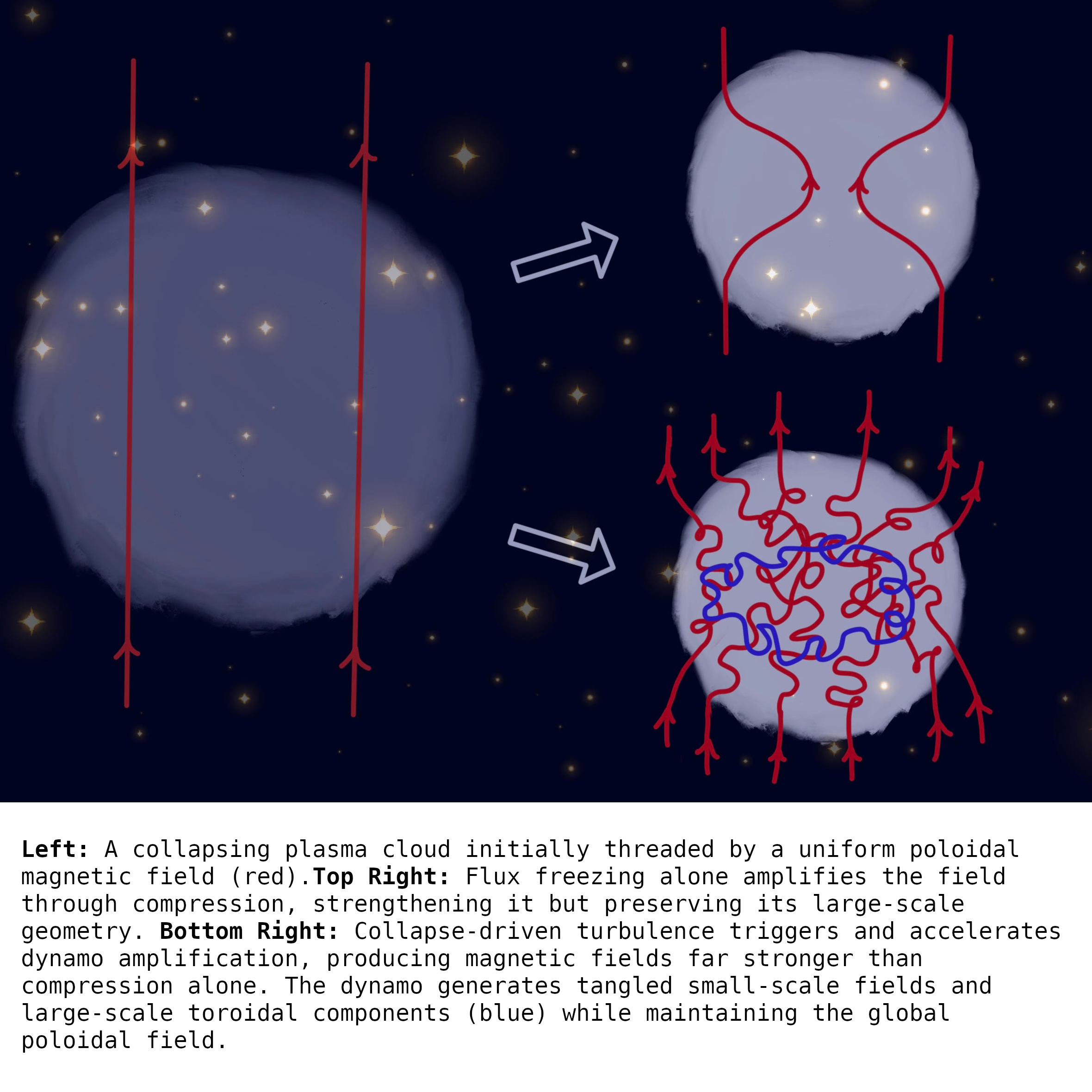 Muhammad Irshad, Pallavi Bhat and their collaborators Kandaswamy Subramanian and Anvar Shukurov have shown how such rapid magnetization may occur. The researchers demonstrated that during the violent gravitational collapse of a protogalactic plasma cloud, turbulence is intensified in a way that dramatically accelerates dynamo action. By reformulating the equations of magnetized fluid flow in coordinates that naturally account for cosmic expansion or contraction, they model a collapsing cloud and find that magnetic fields can grow even faster than exponentially. The acceleration of large-scale turbulent eddies during collapse acts as a powerful catalyst, enabling strong magnetic fields to emerge on much shorter timescales than previously expected.