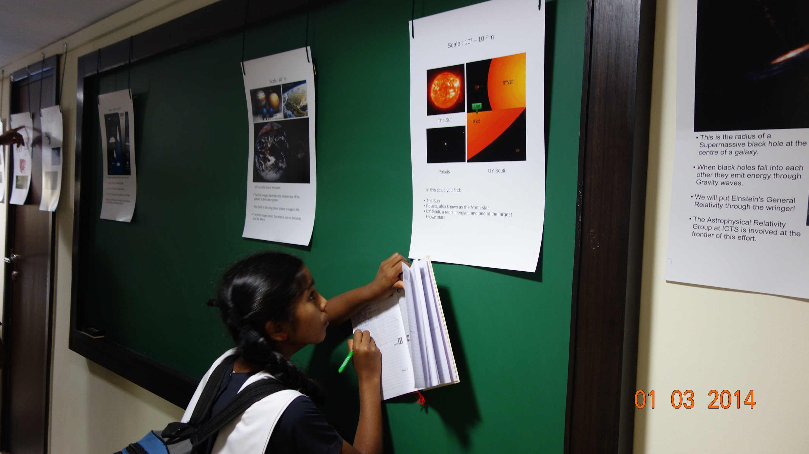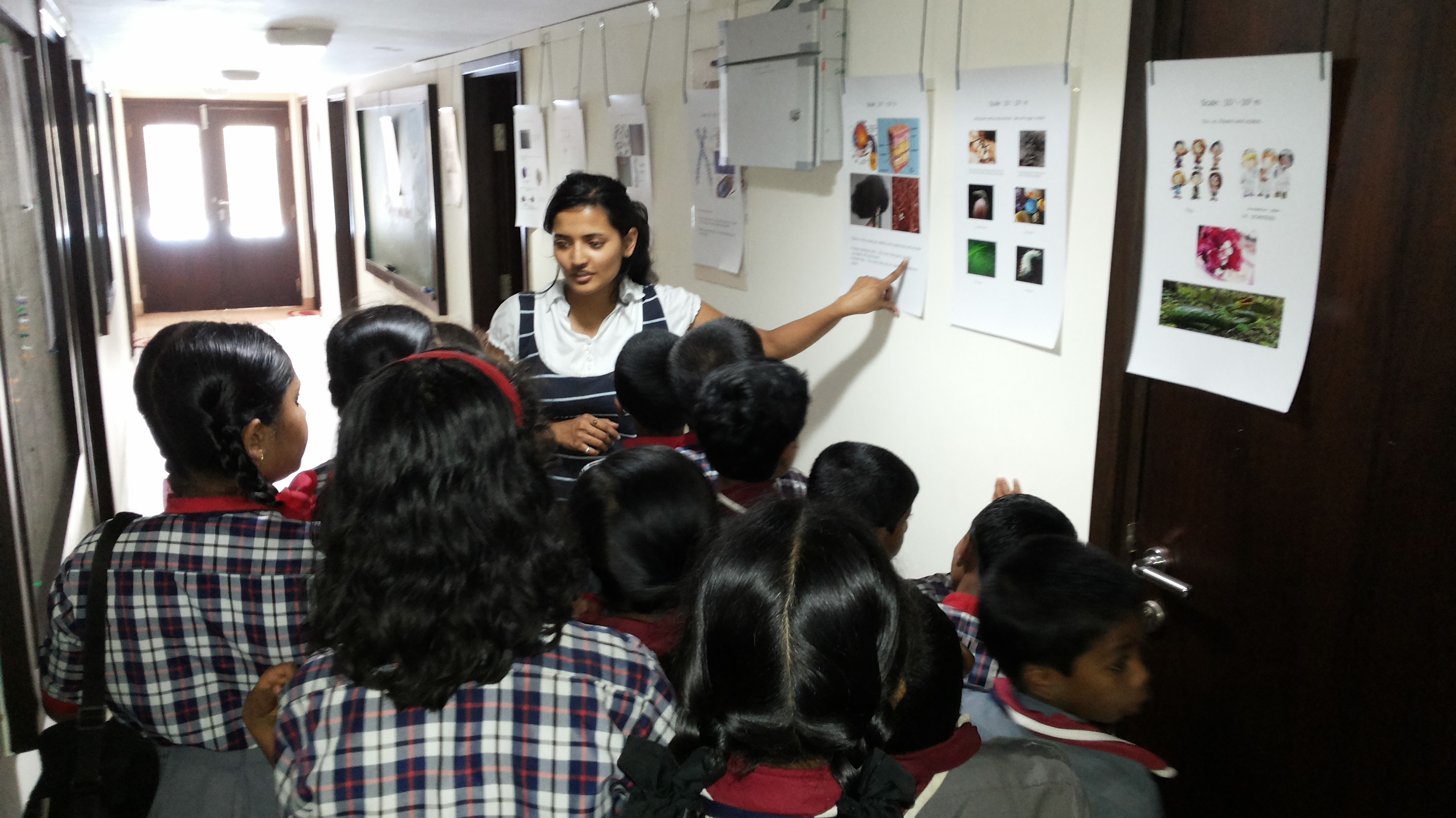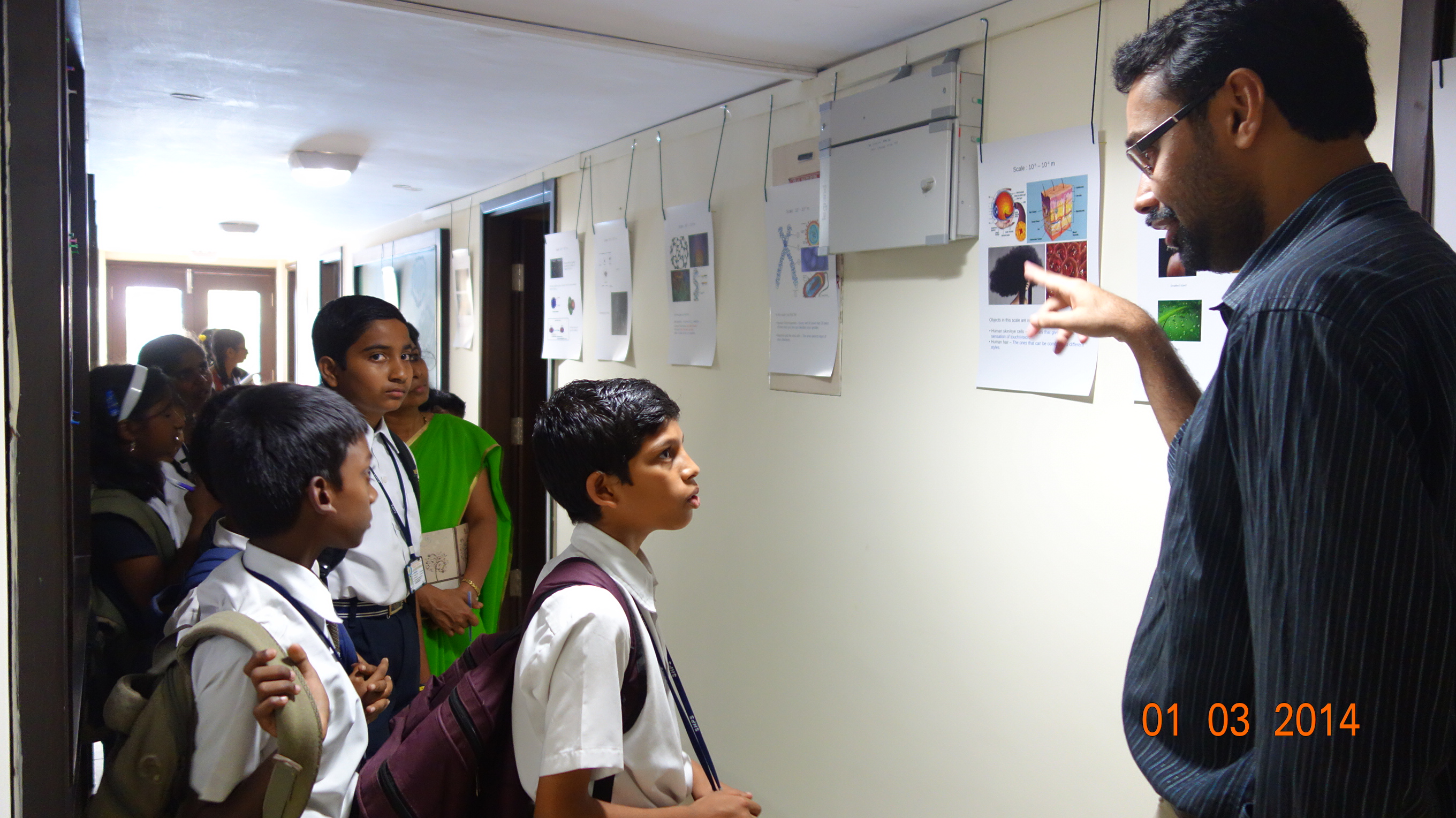 "The Scales of the Universe" was a visual demonstration of the various length scales present in the Universe, plotted on a log scale. It ranged from 10^(-35) m (-35 on the log scale), i.e, the length scale of string theory and quantum gravity, to 10^(26) m (+26 on the log scale), ie, the length scale of the observable universe. This demonstration was extended along the entire length of the ICTS corridor. There were total of 20 posters that gave visual representation of the physical phenomena, including subatomic particles, DNA, cells, organisms, oceans, planets, stars, and galaxies.