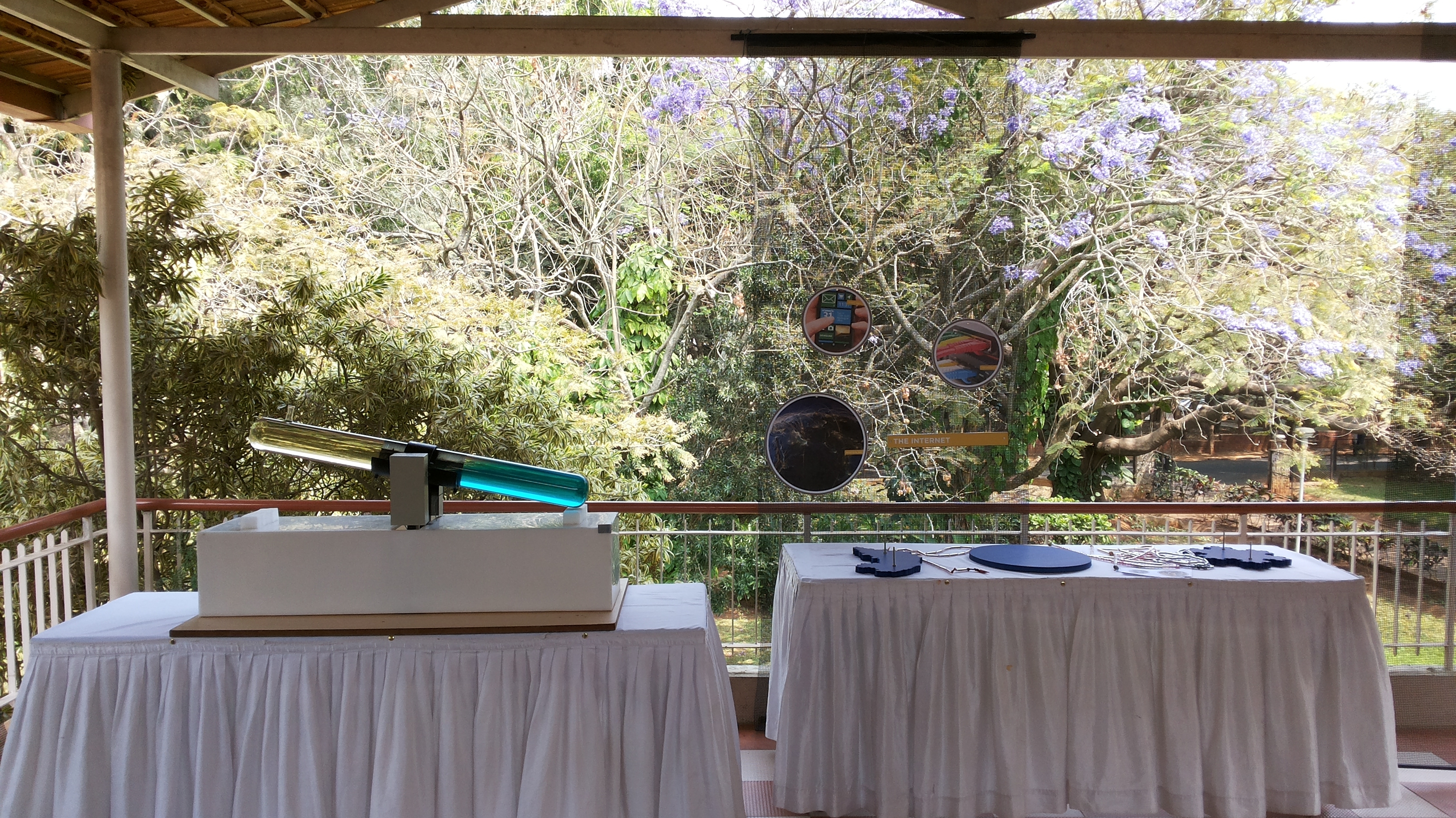 There were few Mathematics of Planet Earth 2013 exhibits like Wave tube, Chladni's Plate, Fractals, Walk the function, Permeability demonstrated along with posters on Mathematical equations and Mathematics in everyday life. There were screening of videos about in-house research and ICTS faculty showcasing their area of research. There was also a display of ICTS site progress photographs.