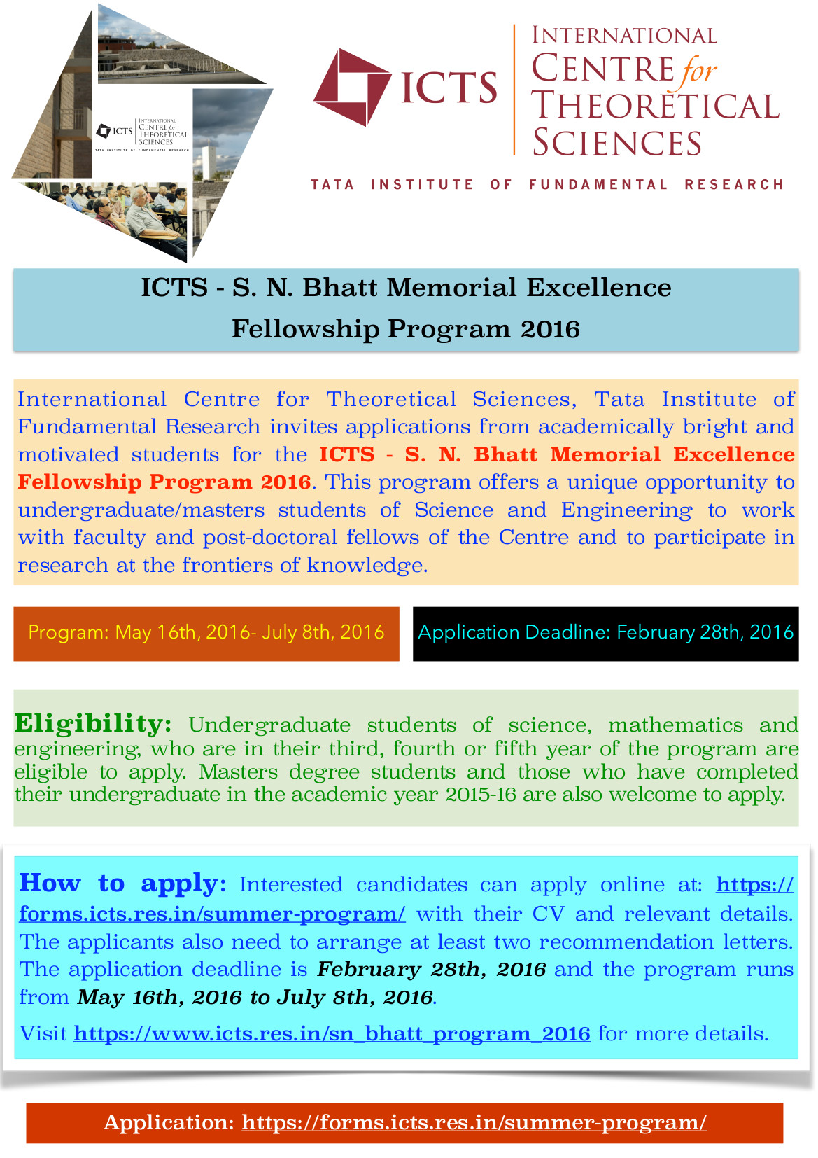 International Centre for Theoretical Sciences, Tata Institute of Fundamental Research invites applications from academically bright and motivated students for the ICTS - S. N. Bhatt Memorial Excellence Fellowship Program every summer typically around middle of May till middle of July. This program offers a unique opportunity to undergraduate/masters students of Science and Engineering to work with faculty and post-doctoral fellows of the Centre and to participate in research at the frontiers of knowledge.