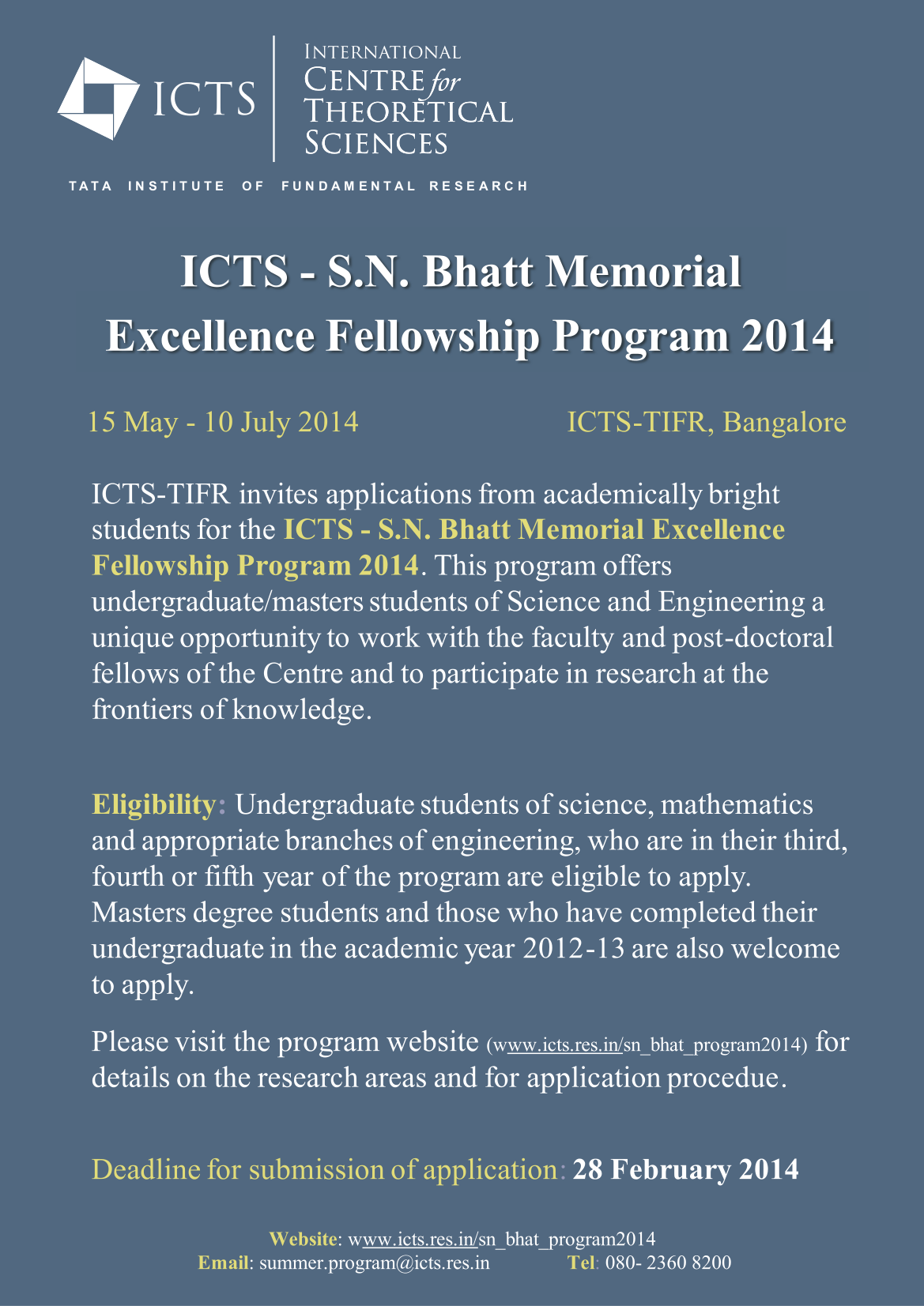 International Centre for Theoretical Sciences of the Tata Institute of Fundamental Research (ICTS-TIFR), Bangalore, invites applications from highly motivated and academically bright students for a summer program, ICTS - S.N. Bhatt Memorial Excellence Fellowship Program 2014.