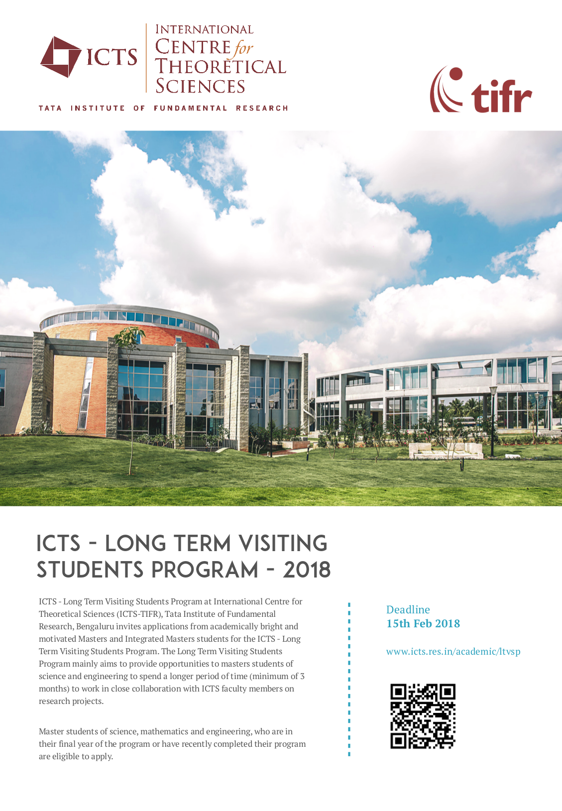 International Centre for Theoretical Sciences (ICTS-TIFR), Tata Institute of Fundamental Research, Bengaluru invites applications from academically bright and motivated Masters and Integrated Masters students for the ICTS - Long Term Visiting Students Program. The Long-Term Visiting Students Program mainly aims to provide opportunities to masters students of science and engineering to spend a longer period of time (minimum of 3 months) to work in close collaboration with ICTS faculty members on research projects.
