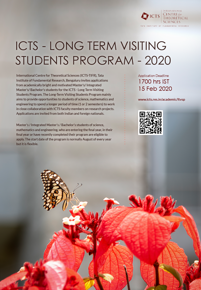 International Centre for Theoretical Sciences (ICTS-TIFR), Tata Institute of Fundamental Research, Bengaluru invites applications from academically bright and motivated Master’s/ Integrated Master’s/ Bachelor’s students for the ICTS - Long Term Visiting Students Program. The Long-Term Visiting Students Program mainly aims to provide opportunities to students of science, mathematics and engineering to spend a longer period of time (1 or 2 semesters) to work in close collaboration with ICTS faculty members on research projects.