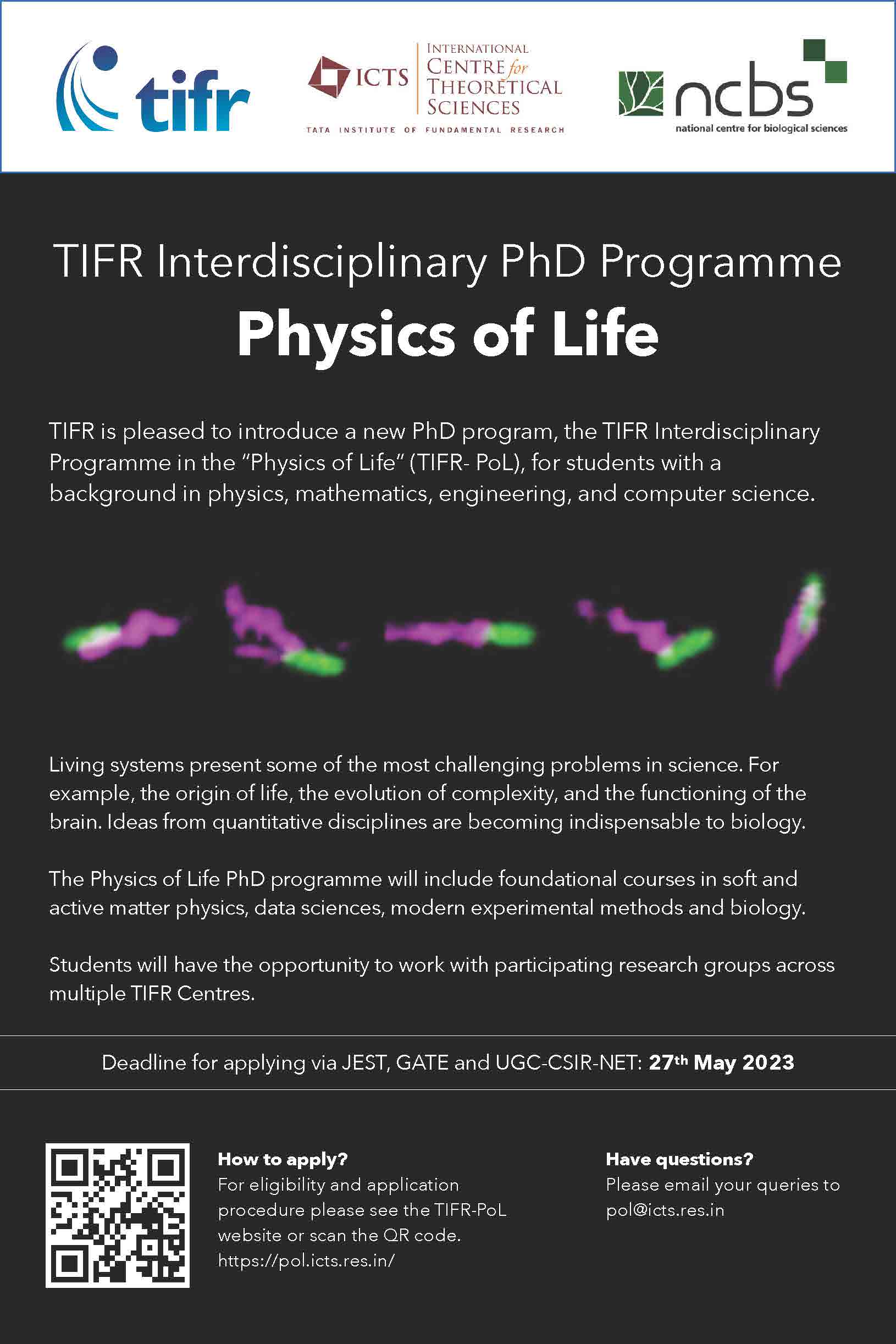 TIFR is pleased to introduce a new Ph.D. program, the TIFR Interdisciplinary Programme in the Physics of Life (TIFR- PoL), for students with a background in physics, engineering, and computer science.