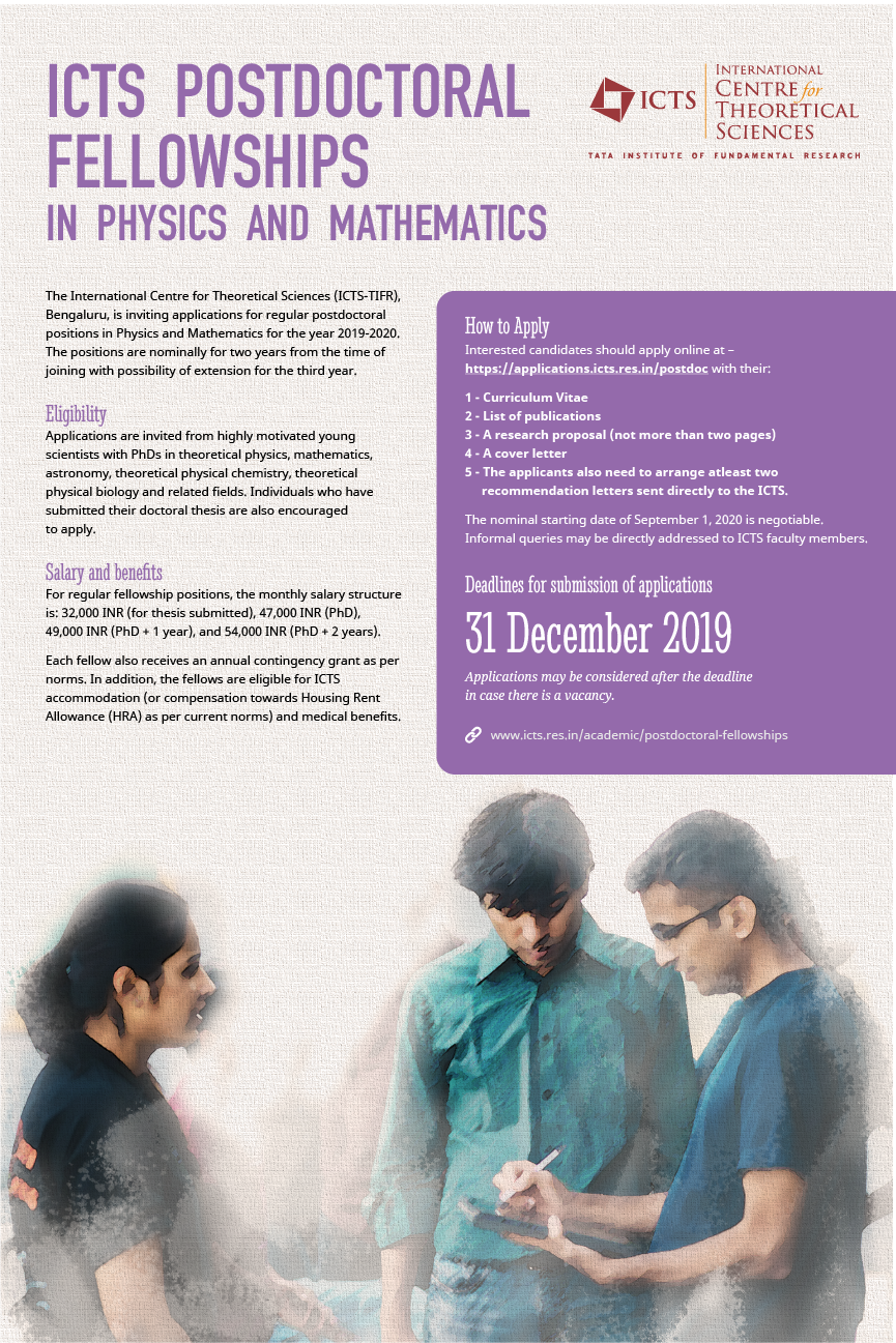 Research facilities: ICTS offers access to high-performance computing facilities, in-house library and to most scientific journals. Support for travel for participation in important international meetings is also available. Postdoctoral fellows will also have opportunities to participate in teaching of graduate courses at ICTS.