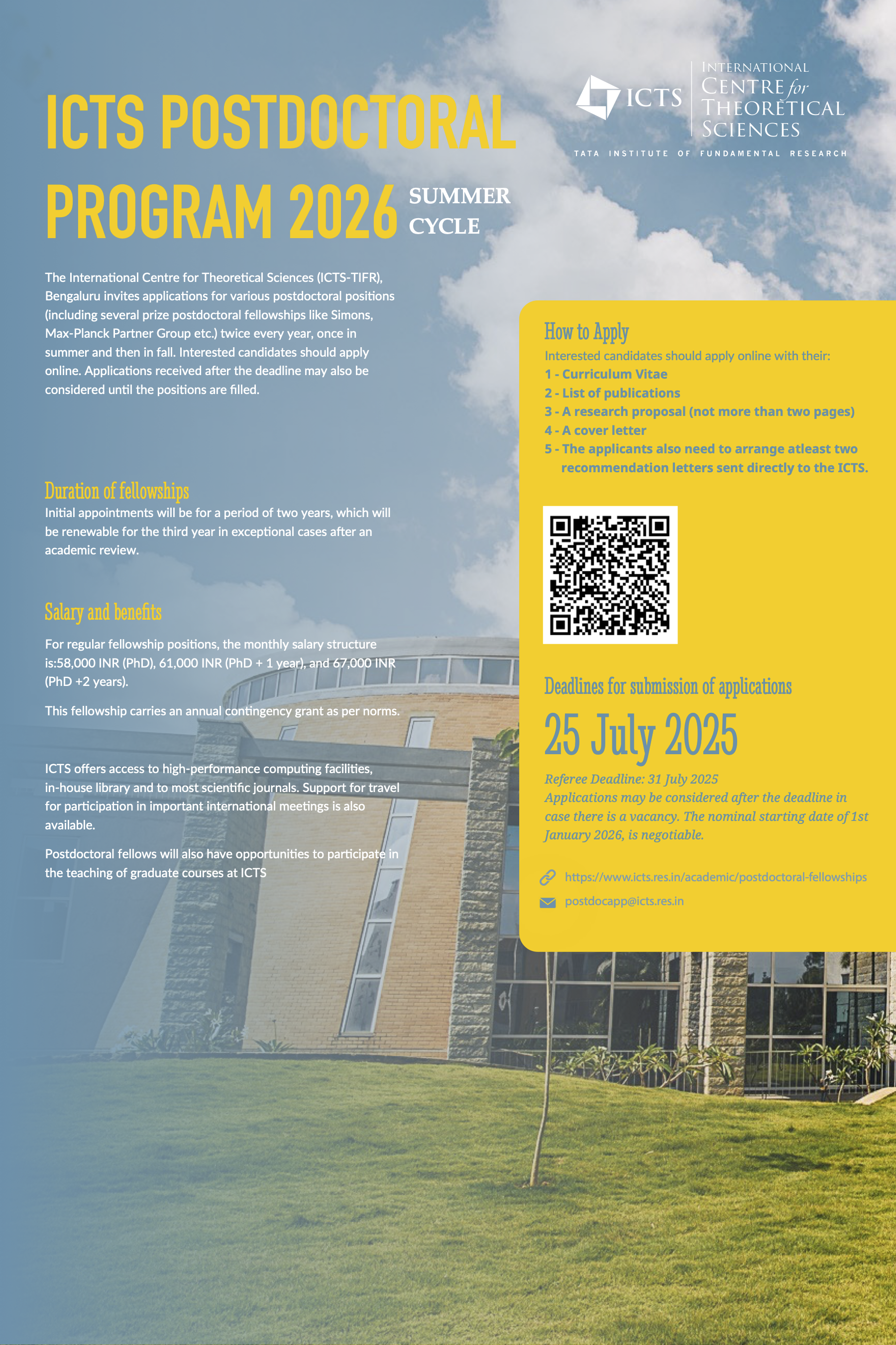ICTS invites applications for various postdoctoral positions (including several prize postdoctoral fellowships like Simons, Max-Planck Partner Group etc.) twice every year, once in summer and then in fall. Interested candidates should apply online. Applications received after the deadline may also be considered until the positions are filled.