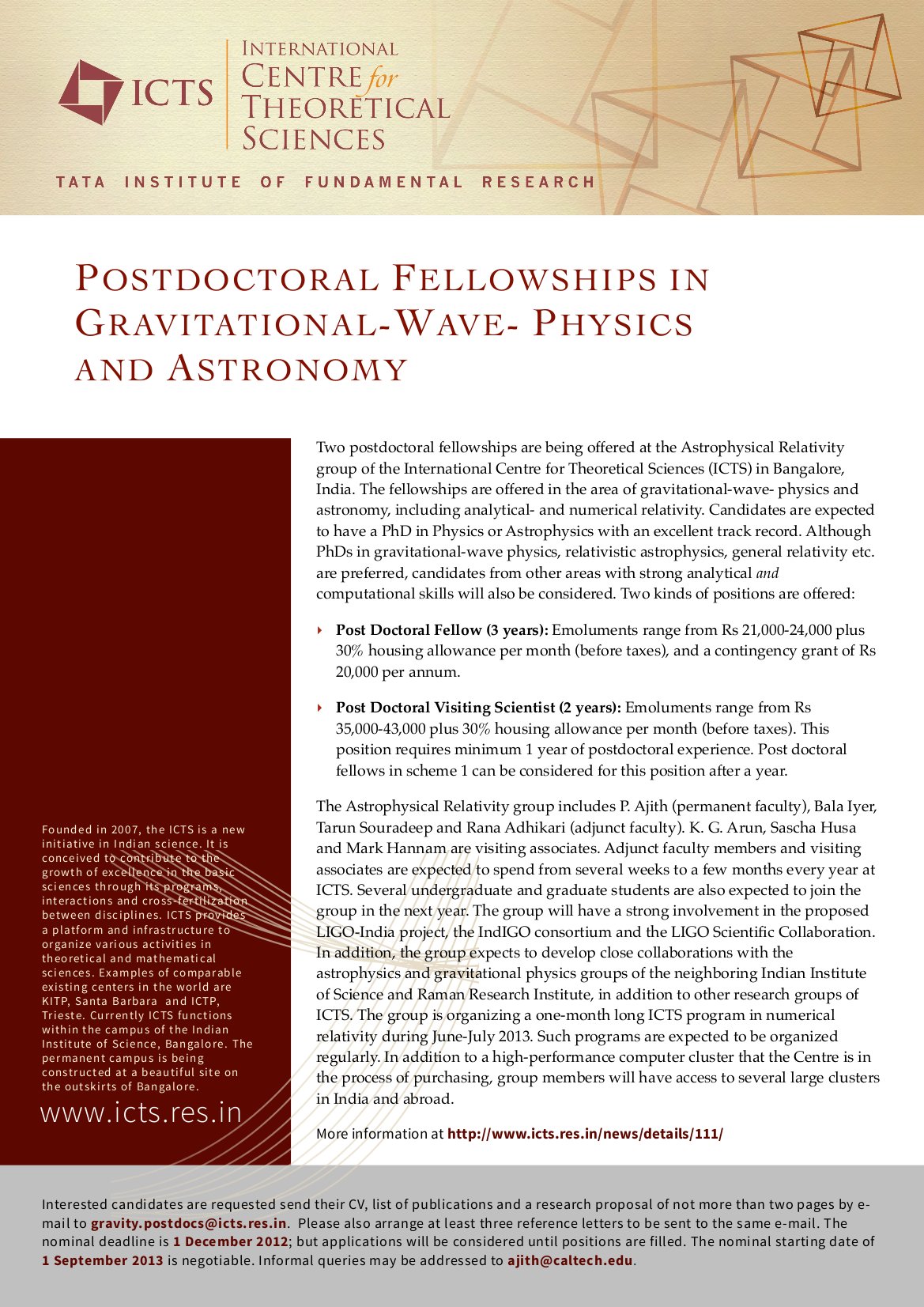 Interested candidates are requested send their CV, list of publications and a research proposal of not more than two pages by e-mail to gravity.postdocs@icts.res.in. Please also arrange at least three reference letters to be sent to the same e-mail. The nominal deadline is 1 December 2012; but applications will be considered until positions are filled. The nominal starting date of 1 September 2013 is negotiable. Informal queries may be addressed to ajith@caltech.edu.
