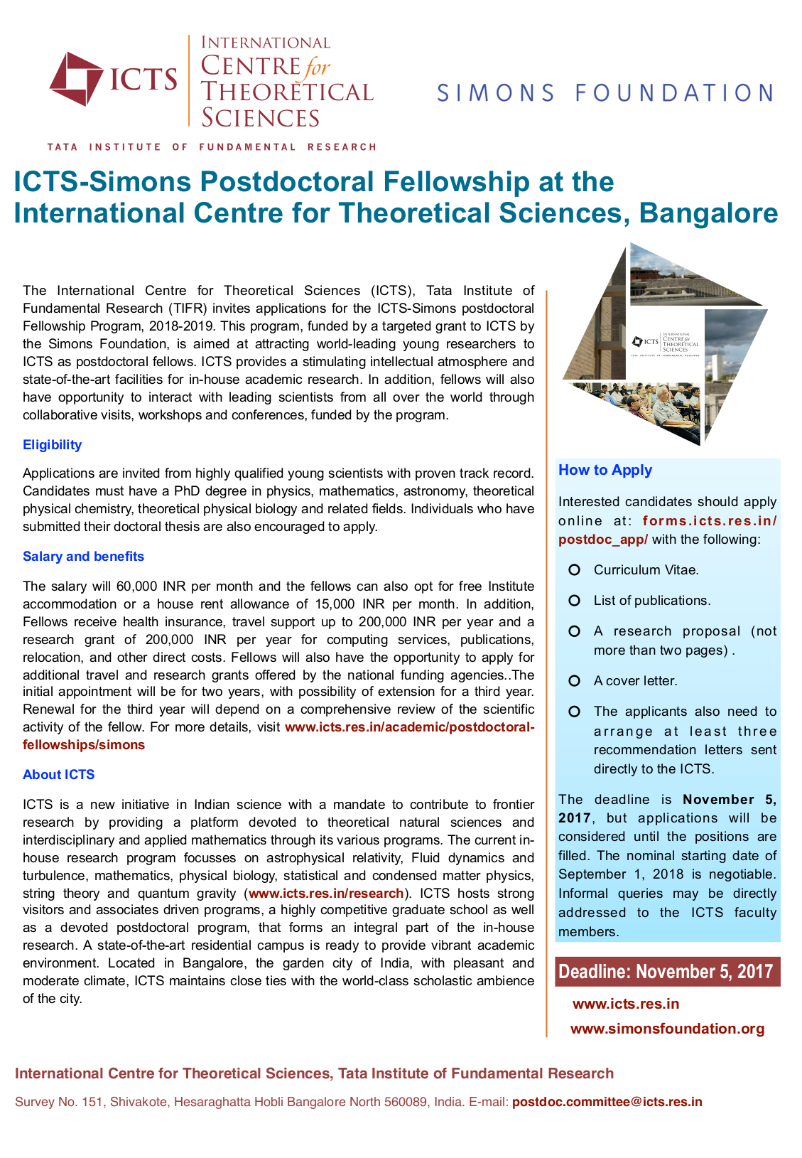 The International Centre for Theoretical Sciences (ICTS), Tata Institute of Fundamental Research (TIFR) invites applications for the ICTS-Simons postdoctoral Fellowship Program, 2017-2018. This program, funded by a targeted grant to ICTS by the Simons Foundation, is aimed at attracting world-leading young researchers to ICTS as postdoctoral fellows. ICTS provides a stimulating intellectual atmosphere and state-of-the-art facilities for academic research. In addition to the vibrant in-house research program, fellows will also have opportunity to interact with leading scientists from all over the world through collaborative visits, workshops and conferences, funded by the program.