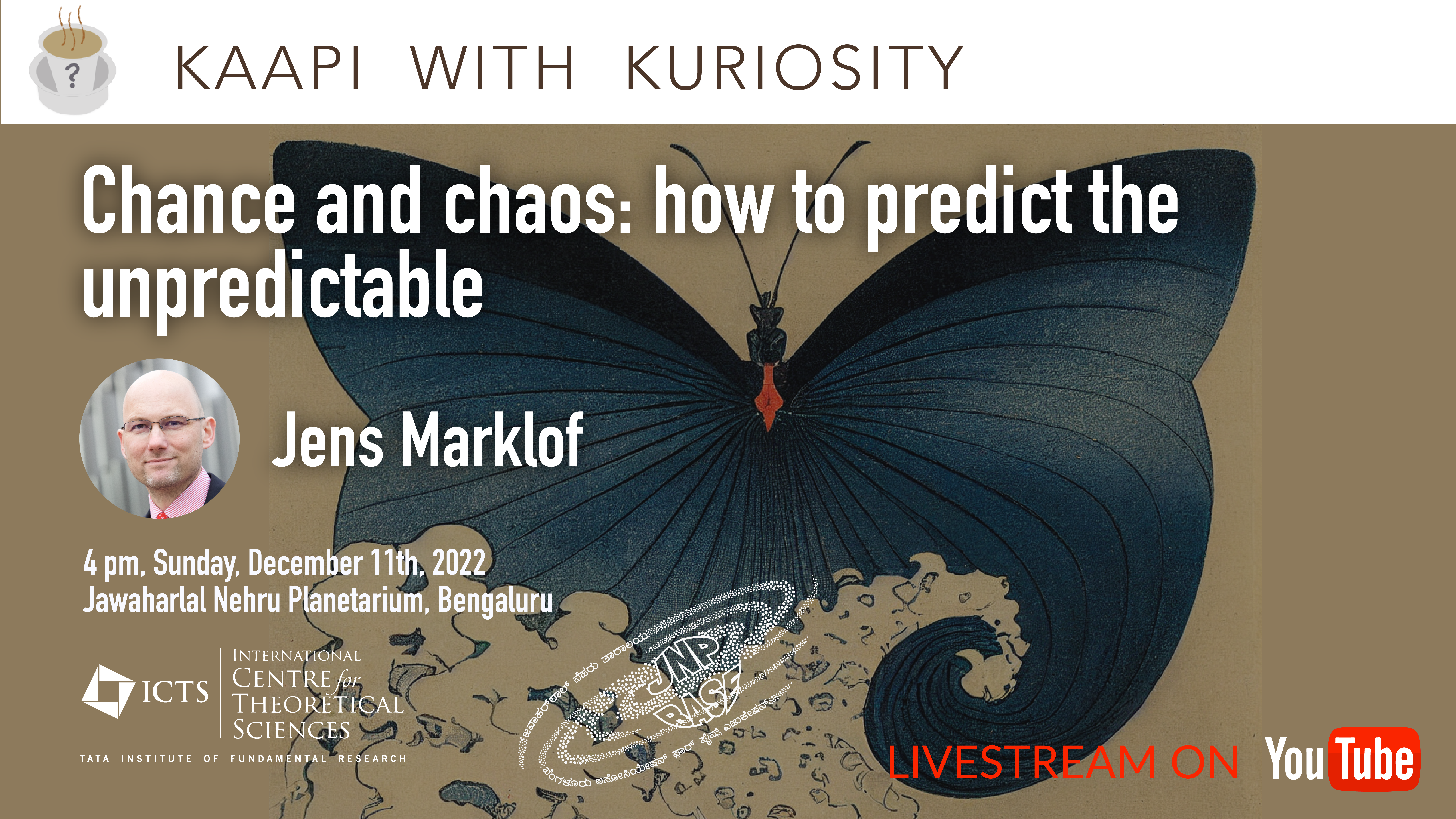 Professor Jens Marklof FRS is an international expert on the mathematical modelling of chaotic systems. His research has answered long-standing questions in quantum chaos, number theory and statistical physics. He graduated from the Universities of Hamburg and Ulm, and held research fellowships at Princeton University, Hewlett-Packard, the Isaac Newton Institute in Cambridge, the Institut des Hautes Etudes Scientifique and the Laboratoire de Physique Theorique et Modeles Statistiques near Paris. Jens Marklof is Professor of Mathematical Physics and Dean of the Faculty of Science at the University of Bristol, and a Fellow of the Royal Society. During the current academic year, he is visiting India as a Royal Society Yusuf Hamied Visiting Professor.