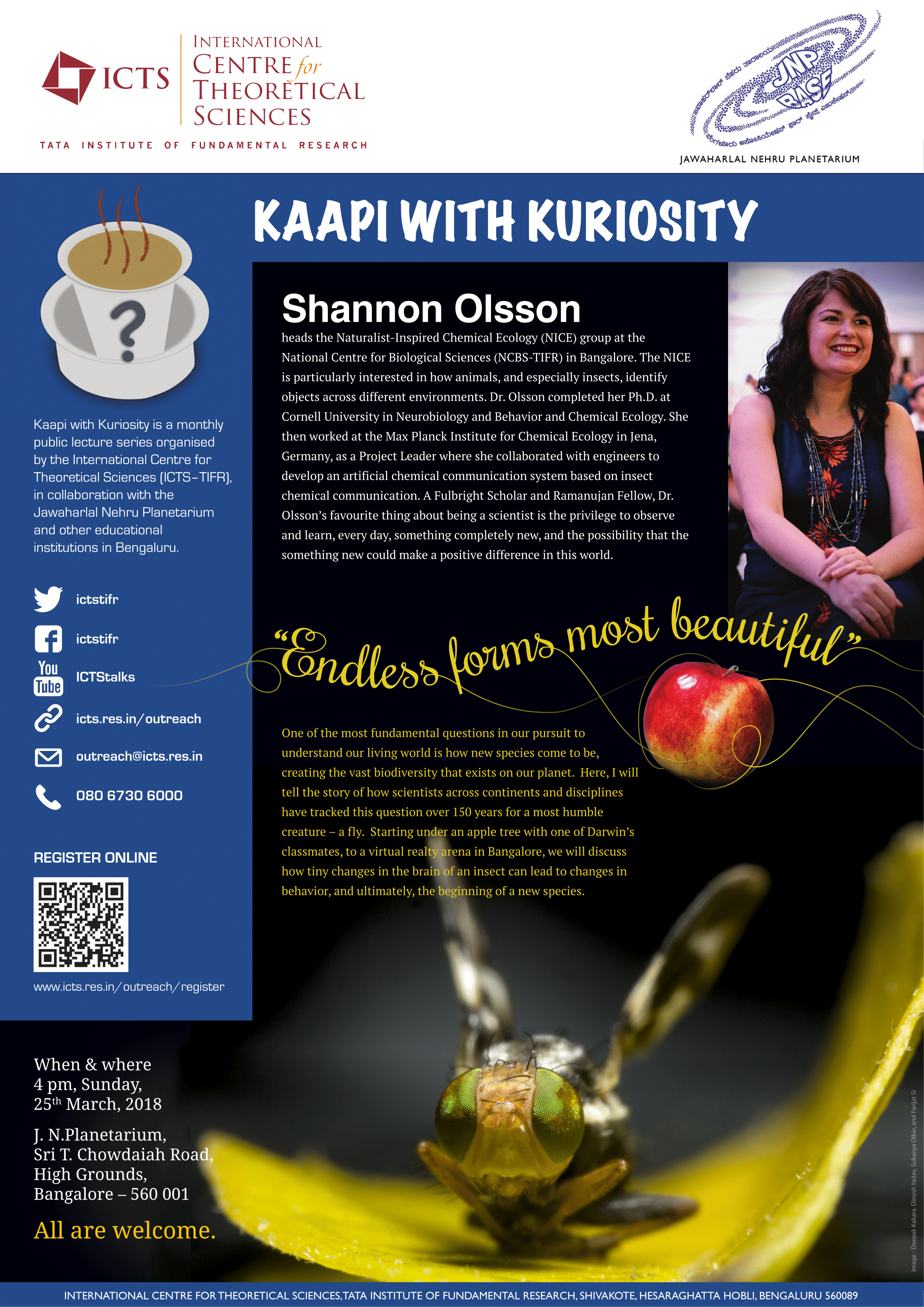 One of the most fundamental questions in our pursuit to understand our living world is how new species come to be, creating the vast biodiversity that exists on our planet. Here, I will tell the story of how scientists across continents and disciplines have tracked this question over 150 years for a most humble creature – a fly. Starting under an apple tree with one of Darwin’s classmates, to a virtual reality arena in Bangalore, we will discuss how tiny changes in the brain of an insect can lead to changes in behavior, and ultimately, the beginning of a new species.