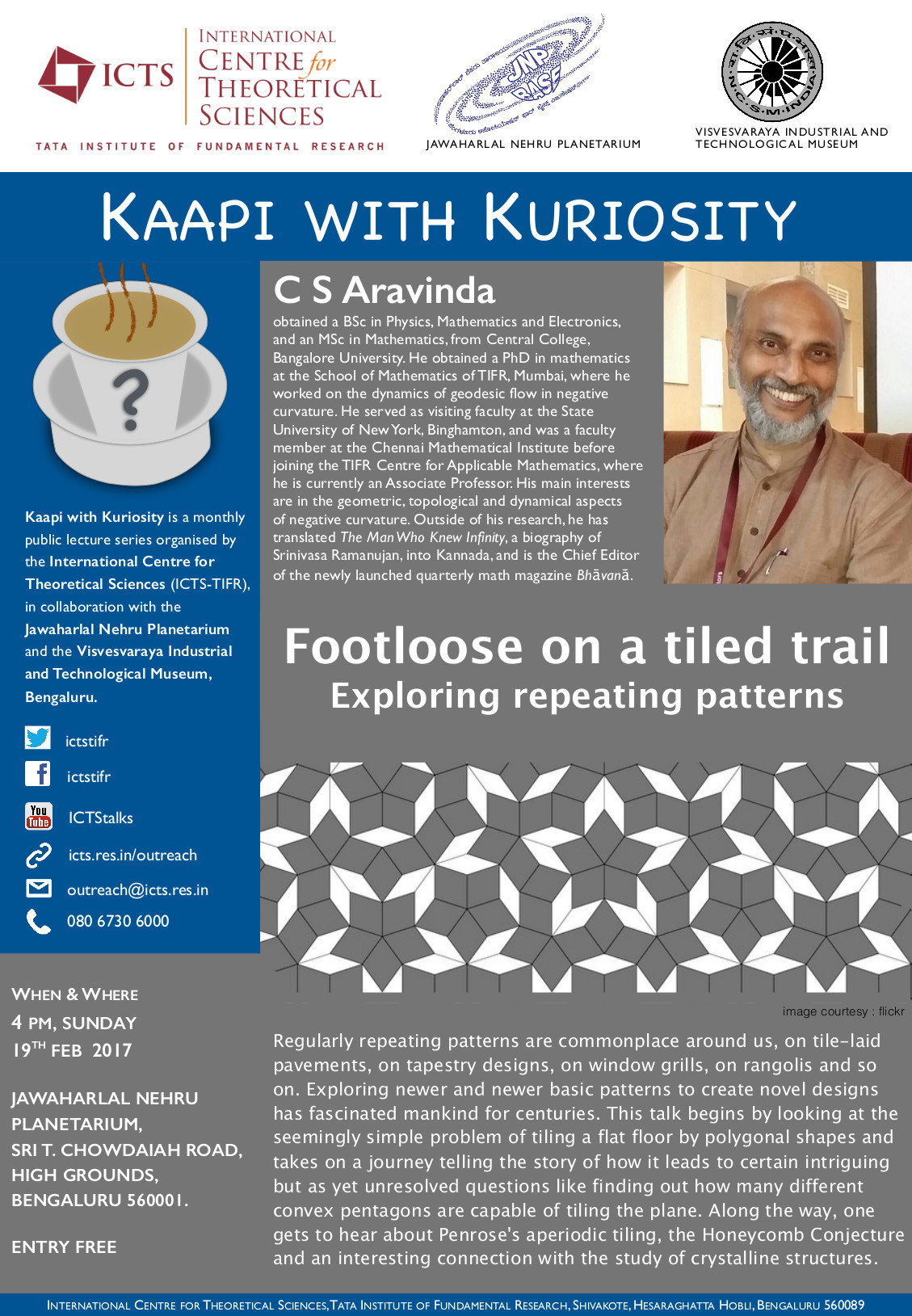 Regularly repeating patterns are commonplace around us, on tile-laid pavements, on tapestry designs, on window grills, on rangolis and so on. Exploring newer and newer basic patterns to create novel designs has fascinated mankind for centuries. This talk begins by looking at the seemingly simple problem of tiling a flat floor by polygonal shapes and takes on a journey telling the story of how it leads to certain intriguing but as yet unresolved questions like finding out how many different convex pentagons are capable of tiling the plane. Along the way, one gets to hear about Penrose's aperiodic tiling, the Honeycomb Conjecture and an interesting connection with the study of crystalline structures.