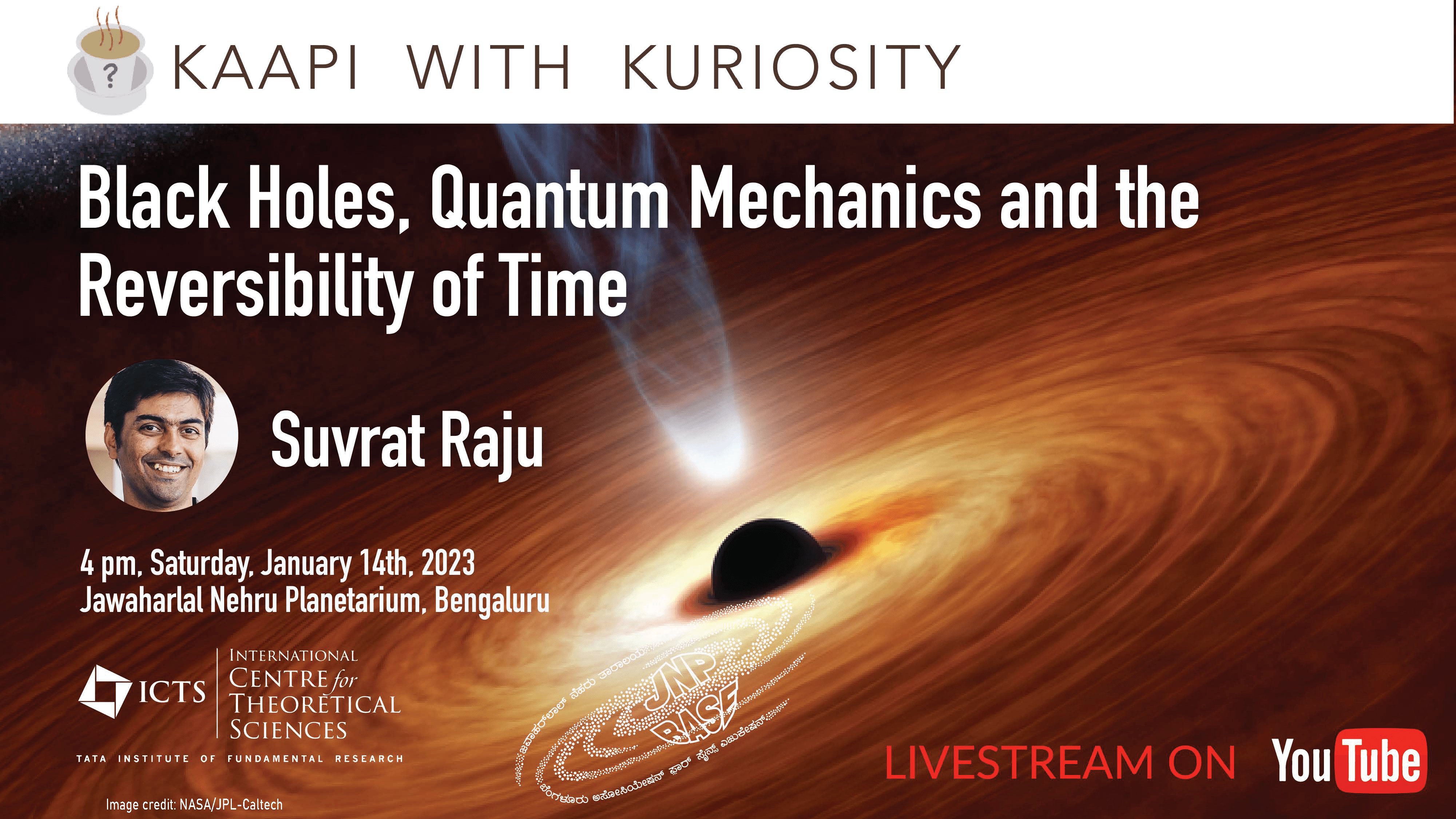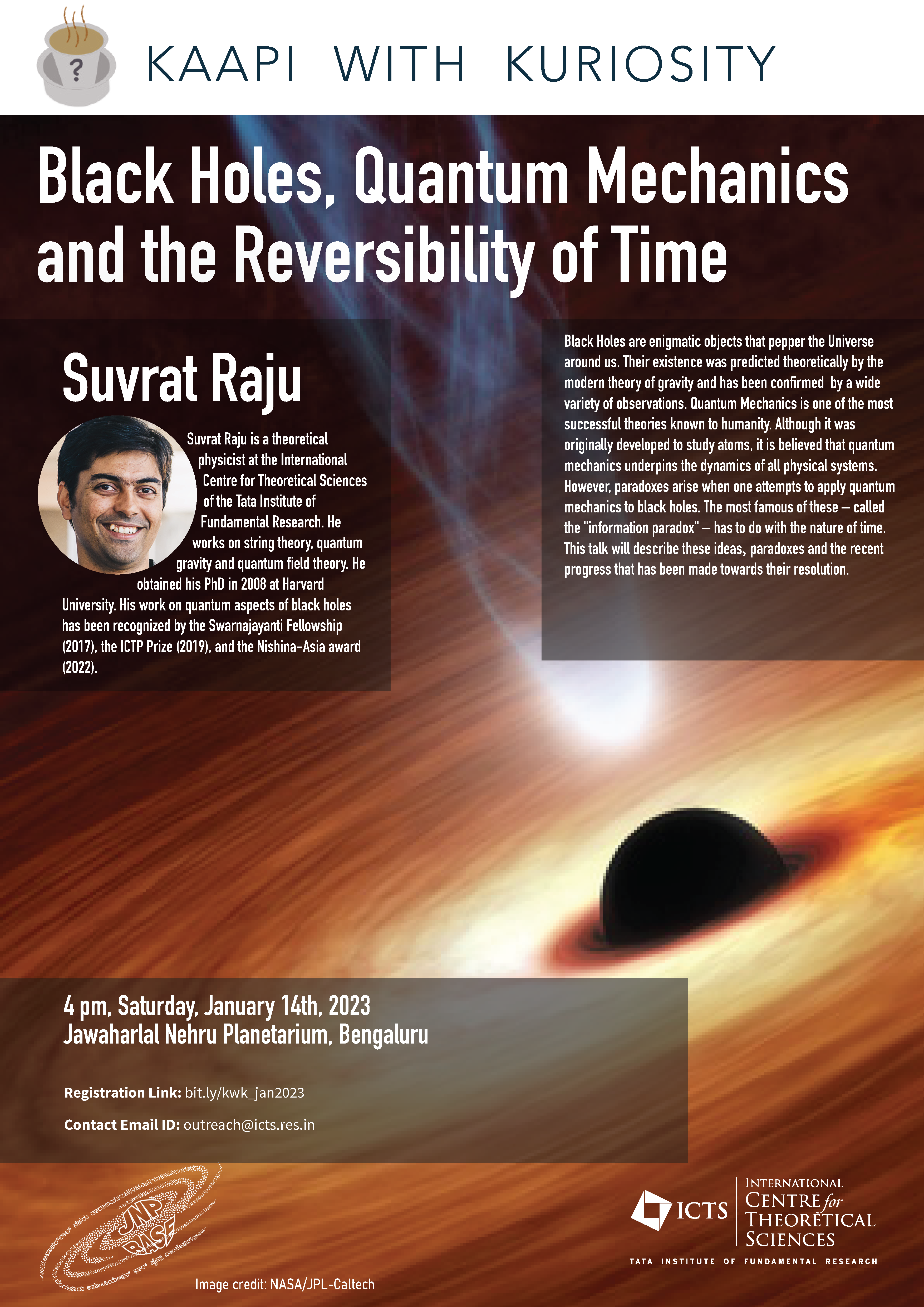 Suvrat Raju is a theoretical physicist at the International Centre for Theoretical Sciences of the Tata Institute of Fundamental Research. He works on string theory, quantum gravity and quantum field theory. He obtained his PhD in 2008 at Harvard University. His work on quantum aspects of black holes has been recognized by the Swarnajayanti Fellowship (2017), the ICTP Prize (2019), and the Nishina-Asia award (2022).