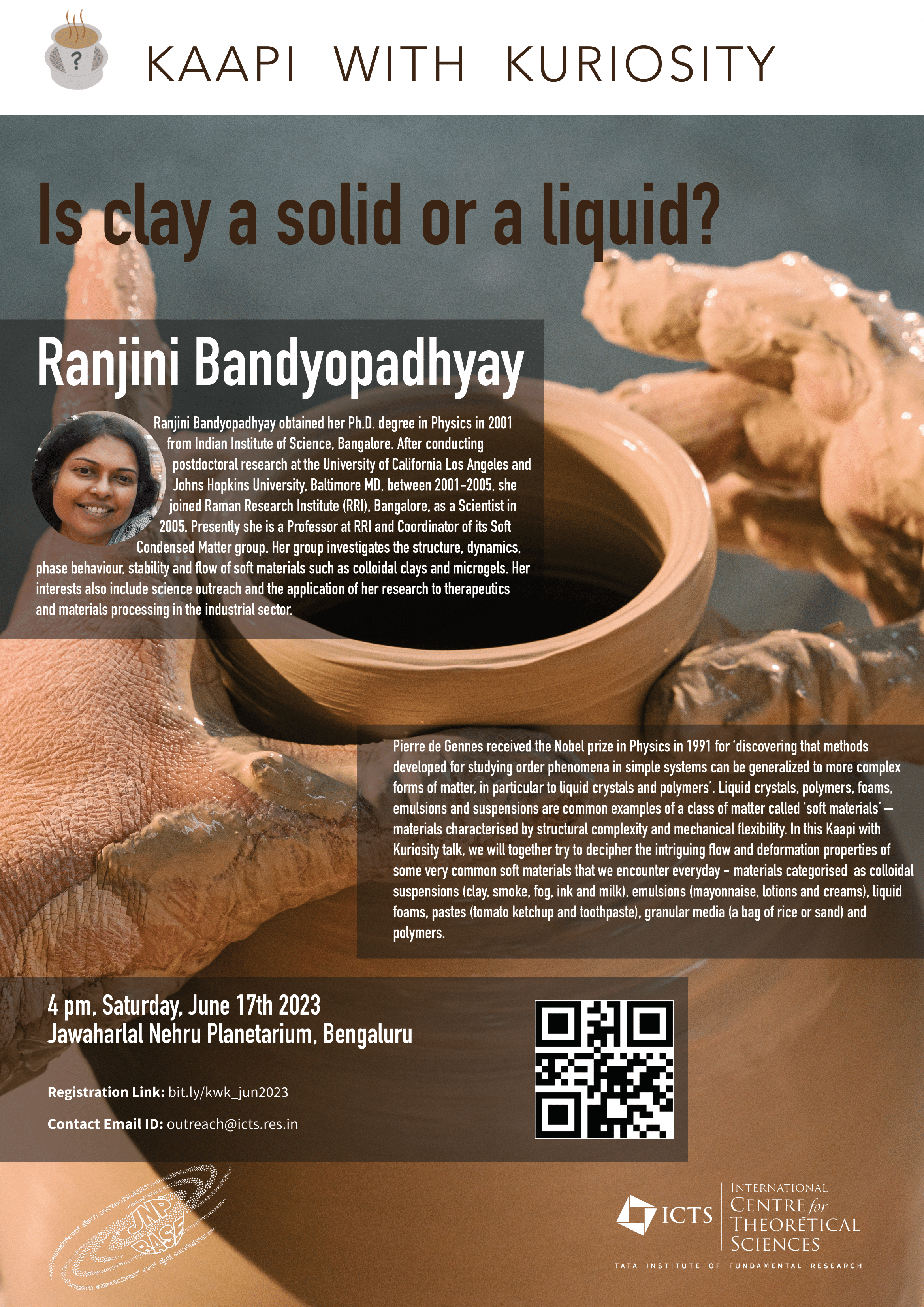 Pierre de Gennes received the Nobel prize in Physics in 1991 for ‘discovering that methods developed for studying order phenomena in simple systems can be generalized to more complex forms of matter, in particular to liquid crystals and polymers’. Liquid crystals, polymers, foams, emulsions and suspensions are common examples of a class of matter called ‘soft materials’ – materials characterised by structural complexity and mechanical flexibility. In this Kaapi with Kuriosity talk, we will together try to decipher the intriguing flow and deformation properties of some very common soft materials that we encounter everyday - materials categorised as colloidal suspensions (clay, smoke, fog, ink and milk), emulsions (mayonnaise, lotions and creams), liquid foams, pastes (tomato ketchup and toothpaste), granular media (a bag of rice or sand) and polymers.