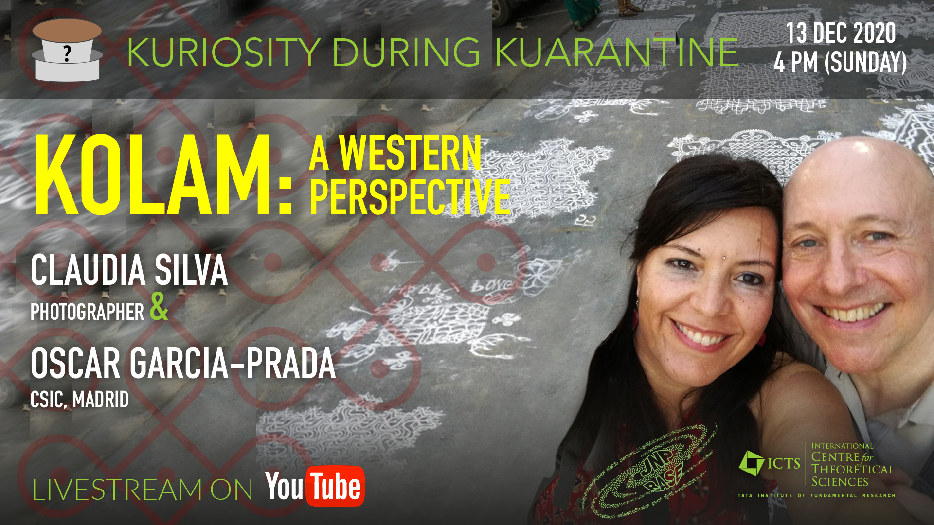 In this talk, we will present some of our impressions and ideas on the beautiful South Indian tradition of kolam. In the first part of the talk, Claudia will show some of her photographs and videos taken in Tamil Nadu in the context of her photographic project "Kolam: An Ephemeral Women´s Art of South India", developed over the last eight years. She will discuss some of the anthropological aspects of kolam and the relation to ephemeral art, education and women cultural practices. After that, Oscar will talk about the geometrical aspects of kolam and the relation to ethnomathematics and computer sciences.