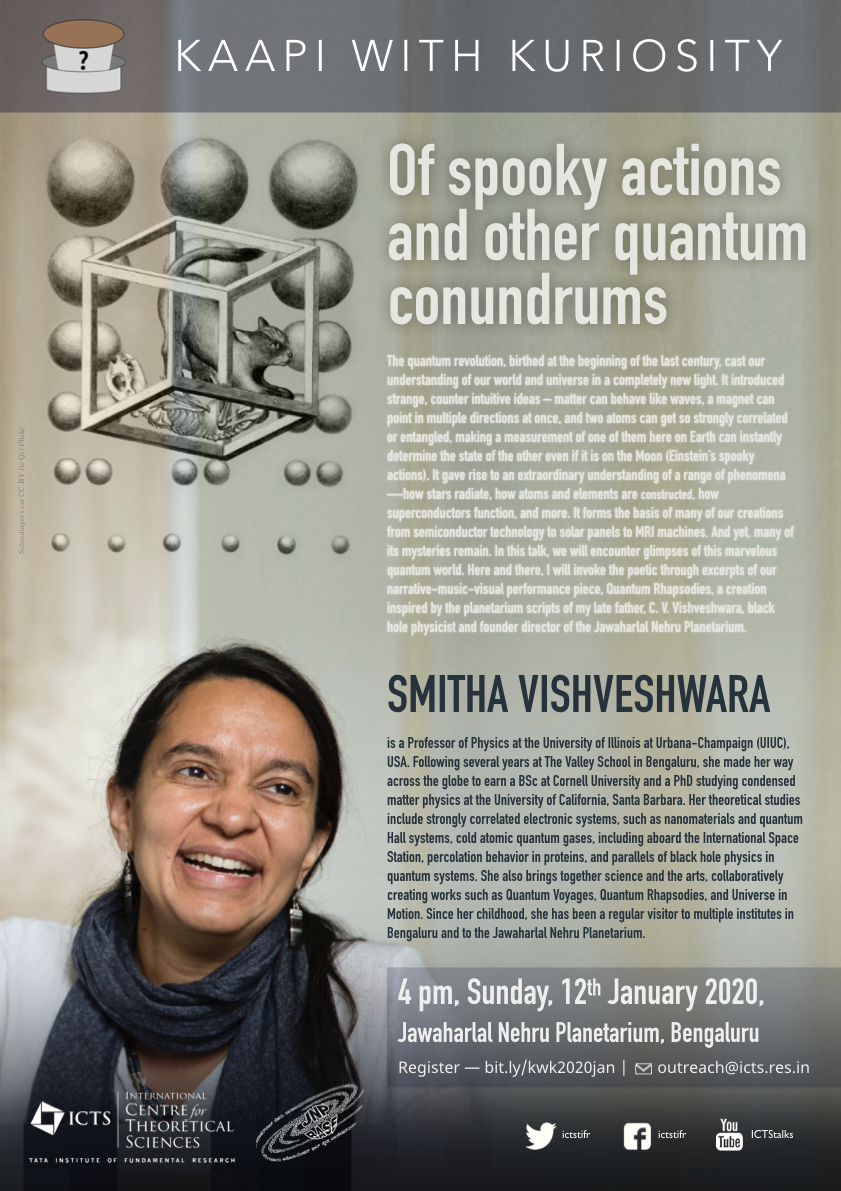 The quantum revolution, birthed at the beginning of the last century, cast our understanding of our world and universe in a completely new light. It introduced strange, counter intuitive ideas – matter can behave like waves, a magnet can point in multiple directions at once, and two atoms can get so strongly correlated or entangled, making a measurement of one of them here on Earth can instantly determine the state of the other even if it is on the Moon (Einstein’s spooky actions). It gave rise to an extraordinary understanding of a range of phenomena—how stars radiate, how atoms and elements are constructed, how superconductors function, and more. It forms the basis of many of our creations from semiconductor technology to solar panels to MRI machines. And yet, many of its mysteries remain. In this talk, we will encounter glimpses of this marvelous quantum world. Here and there, I will invoke the poetic through excerpts of our narrative-music-visual performance piece, Quantum Rhapsodies, a creation inspired by the planetarium scripts of my late father, C. V. Vishveshwara, black hole physicist and founder director of the Jawaharlal Nehru Planetarium.