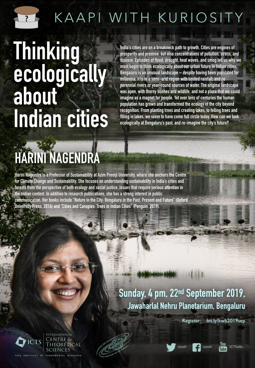 India's cities are on a breakneck path to growth. Cities are engines of prosperity and promise, but also concentrations of pollution, stress, and disease. Episodes of flood, drought, heat waves, and smog tell us why we must begin to think ecologically about our urban future in Indian cities. Bengaluru is an unusual landscape – despite having been populated for millennia, it is in a semi-arid region with limited rainfall, and no perennial rivers or year-round sources of water. The original landscape was open, with thorny bushes and wildlife, and not a place that we could imagine as a magnet for people. Yet over tens of centuries the human population has grown and transformed the ecology of the city beyond recognition. From planting trees and creating lakes, to felling trees and filling in lakes, we seem to have come full circle today. How can we look ecologically at Bengaluru’s past, and re-imagine the city’s future?