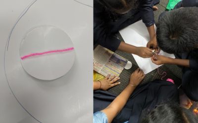 The ICTS Outreach team visited HSLN Global Smart School in Hesaraghatta and conducted a short workshop for 26 students from classes 8, 9, and 10. The session focused on understanding the number pi (π). Students explored two methods of estimating pi. One method involved using a circular disc and thread to measure the ratio of the circumference and the diameter, and the other using polygons with an increasing number of sides drawn inside and outside a circle to calculate their perimeters. Through hands-on activities and visual aids, students gained insight into how pi was estimated in ancient times using geometry.