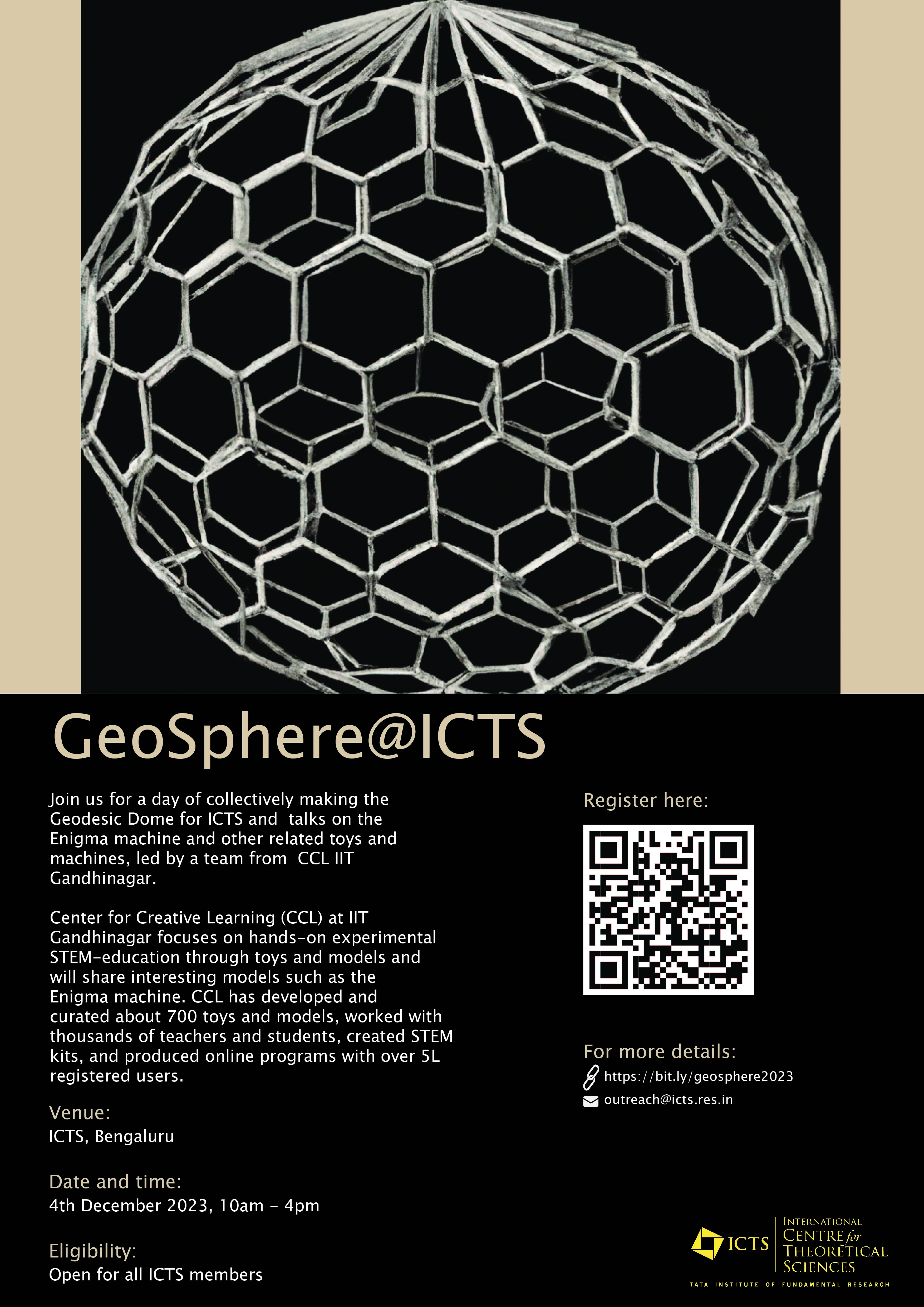 Join us for a day of making the Geodesic Dome at ICTS followed by talks on Enigma machine and other related science toys and machines, led by a team from CCL IIT Gandhinagar.