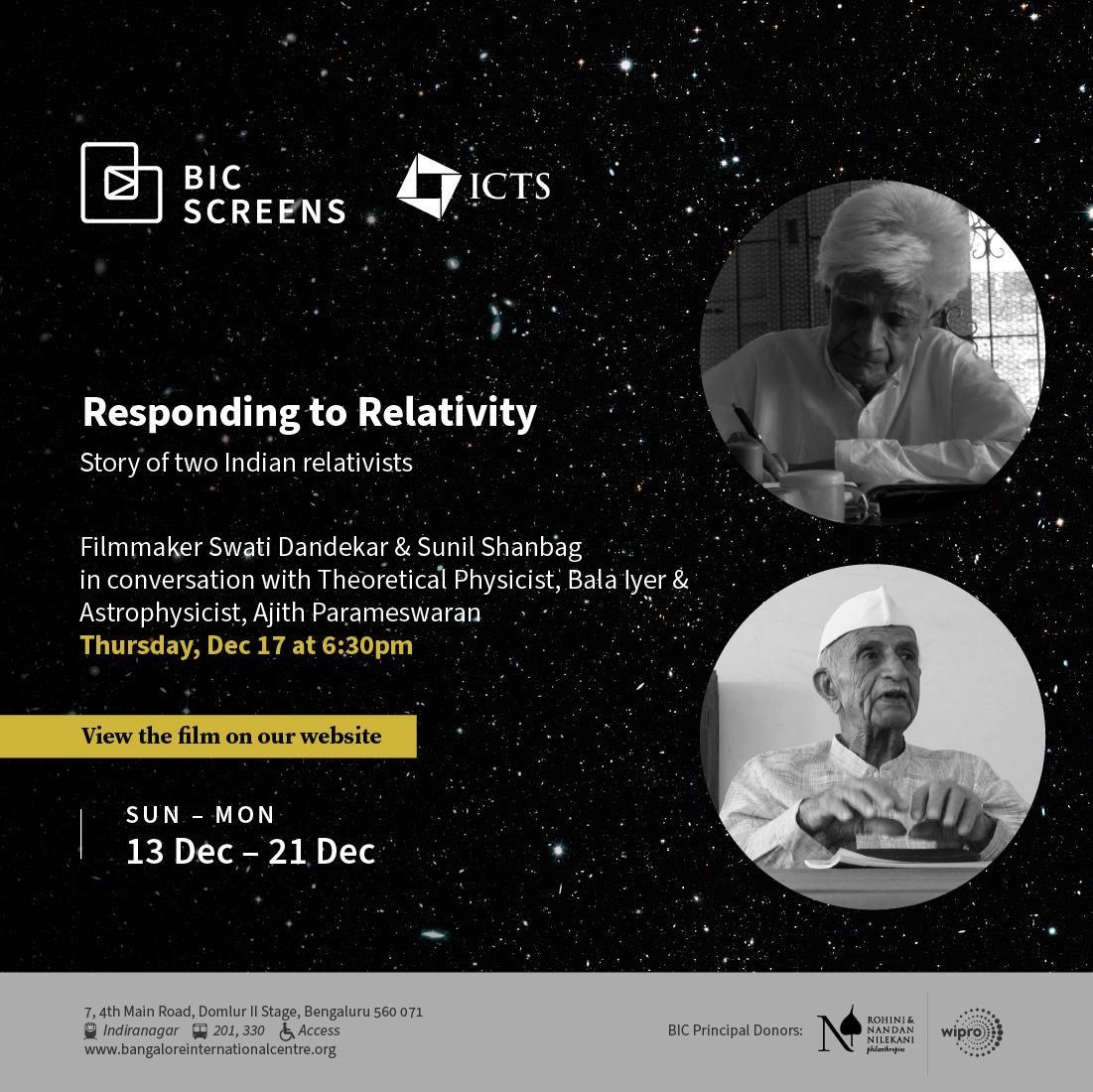 Filmmaker Swati Dandekar & Sunil Shanbag will be in conversation with Theoretical Physicist, Bala Iyer & Astrophysicist, Ajith Parameswaran on Thursday, 17th Dec at 6:30 pm (IST). This virtual event is brought to you in collaboration with Bangalore International Centre (BIC). These films were commissioned by The Inter-University Centre for Astronomy and Astrophysics (IUCAA).