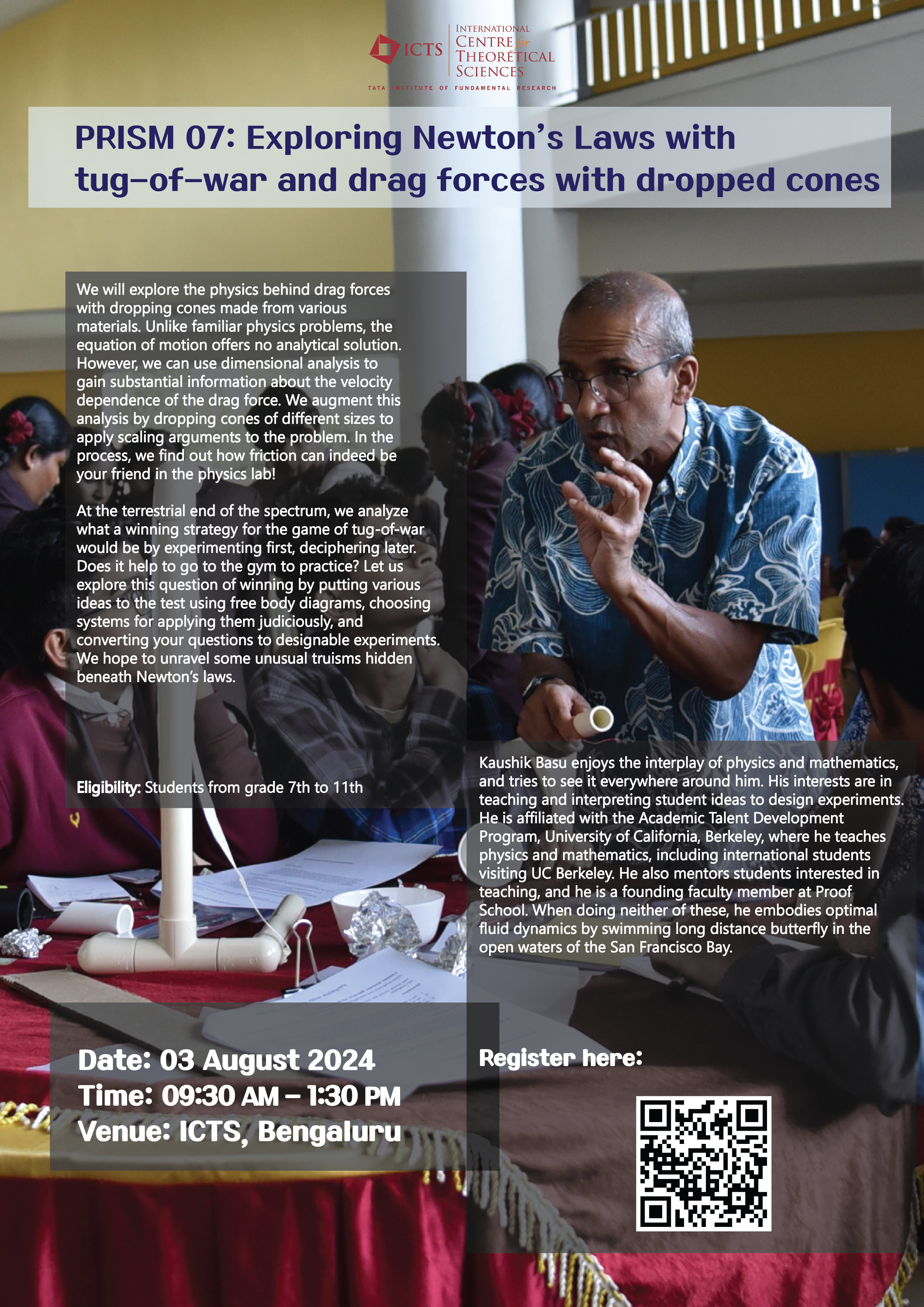 Open to school students from 12 to 16 years in Bengaluru. Please register using the registration link below, for group participation write to 'outreach@icts.res.in'. Participation is by invitation only.