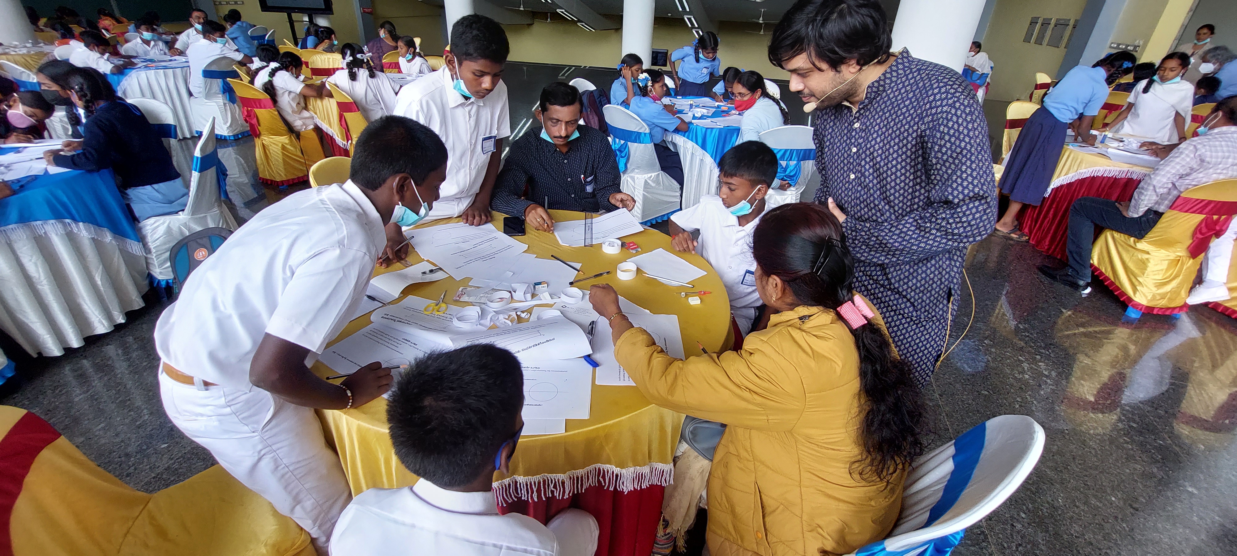 This event had two sessions. The 1st session was a Hands-on Maths Circle Session (https://www.icts.res.in/outreach/maths-circles) in Kannada, involving geometrical construction and maths puzzles, this session was led by Srikanth Pai (ICTS-TIFR). The 2nd session was a science talk in Kannada, ‘Our Universe’, by Pallavi Bhat (ICTS-TIFR), which touched upon interesting phenomena at large length scales.