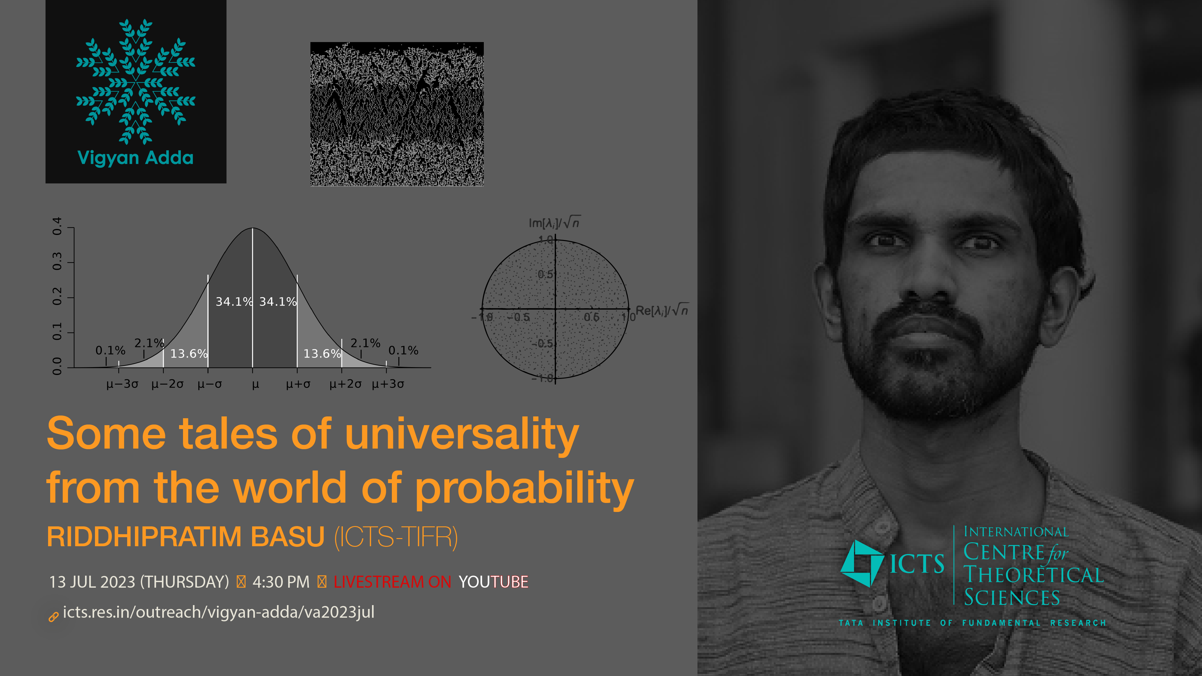 Riddhipratim Basu is a probabilist currently working at the International Centre for Theoretical Sciences, Tata Institute of Fundamental Research. He was educated at the Indian Statistical Institute, Kolkata and obtained his Ph.D. from University of California, Berkeley. Subsequently, he spent two years at Stanford university before joining ICTS in 2017. He is interested in various aspects of probability theory and its applications including models of random growth, random graphs and interacting particle systems