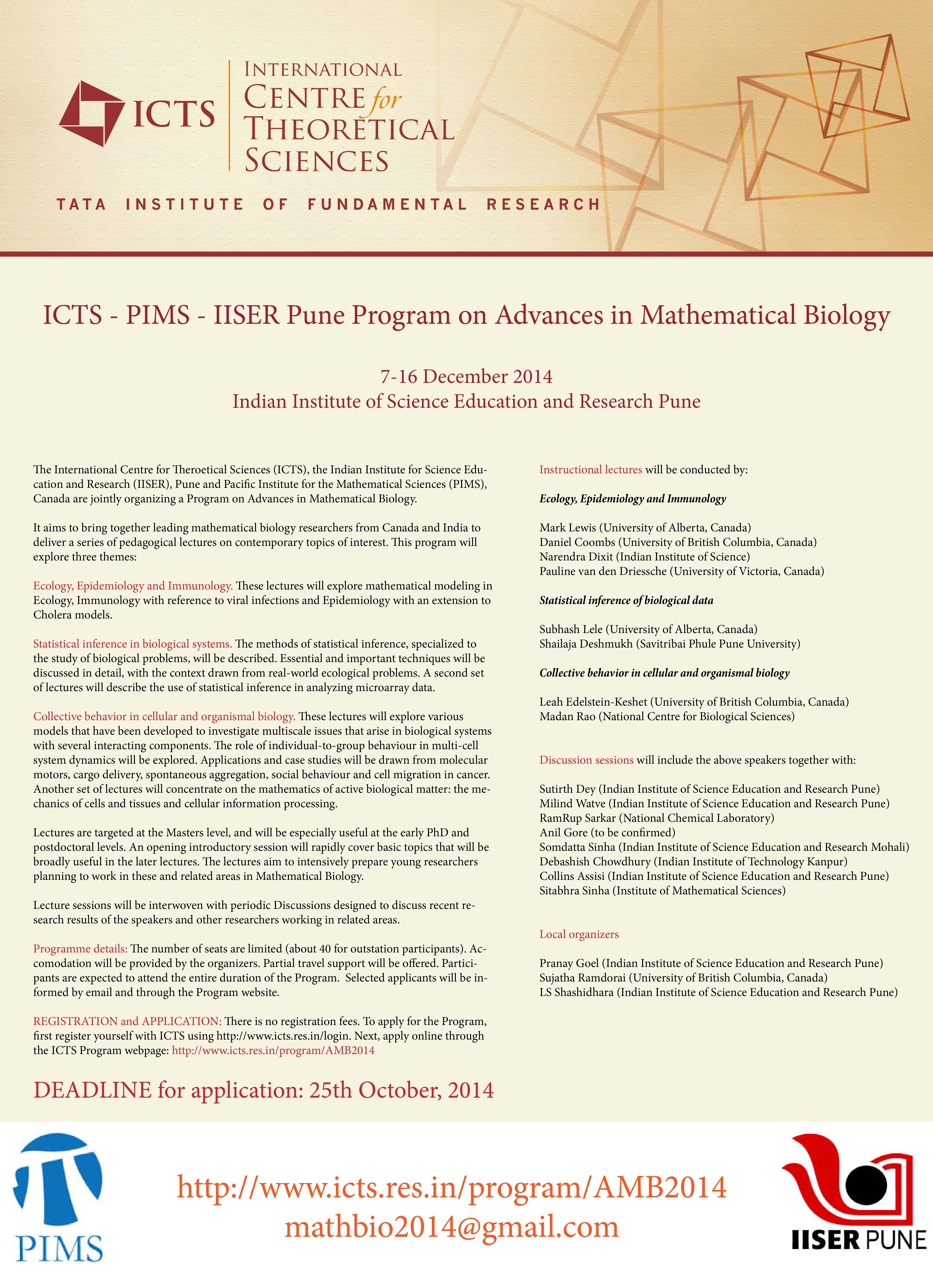 - Ecology, Epidemiology and Immunology. These lectures will explore mathematical modeling in Ecology (Mark Lewis), Immunology with reference to viral infections (Narendra Dixit and Daniel Coombs) and Epidemiology with an extension to Cholera models (Pauline van den Driessche).