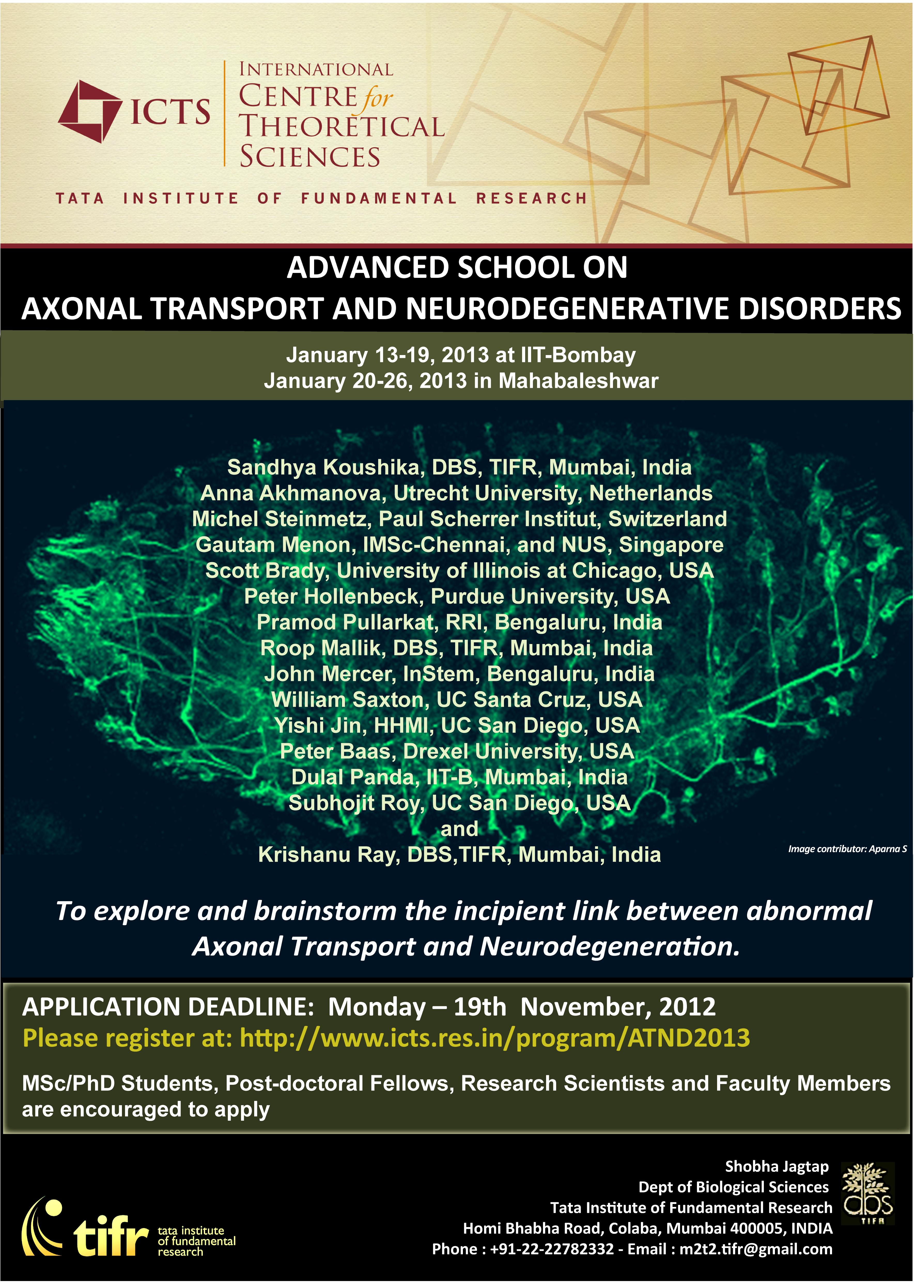 Neurodegeneration, a broad symptom which arises out of several different dysfunctions, is prevalent in aging populations, and it mostly affects people after 50 years of age. There are both hereditary and sporadic cases. Alzheimer’s, Parkinson’s, Huntington’s, Charcot Marie Tooth Type 2A (CMT2A), and a variety of different dementia are some examples. Recent research suggests that aberrant intracellular transport and mutations in the motor protein genes can induce such disorders in model organisms and humans. Recent reports also indicate that loss of mitochondrial transport, as well as the slow axonal transport, can induce dementia and neurofibrillary plaques in the brain. In view of these and other related developments, a large body of research has been launched world-wide to elucidate the connection between defective axonal transport and neurodegeneration. This ICTS program, jointly organized by faculties from TIFR, IIT Bombay and UC San Diego, will highlight this new area of research. The program will be organized in two parts: