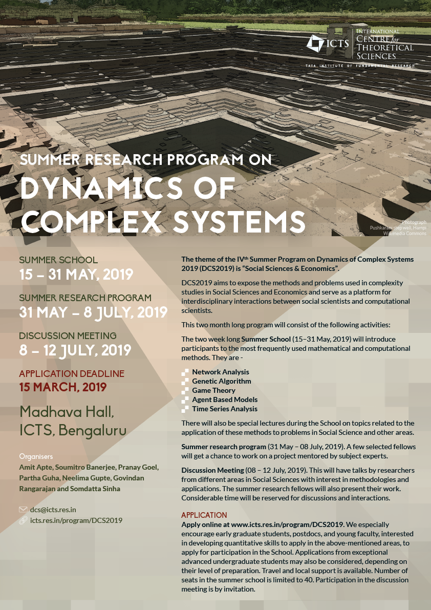The theme of the Fourth Summer Program on Dynamics of Complex Systems 2019 (DCS2019) is “Social Sciences & Economics”.