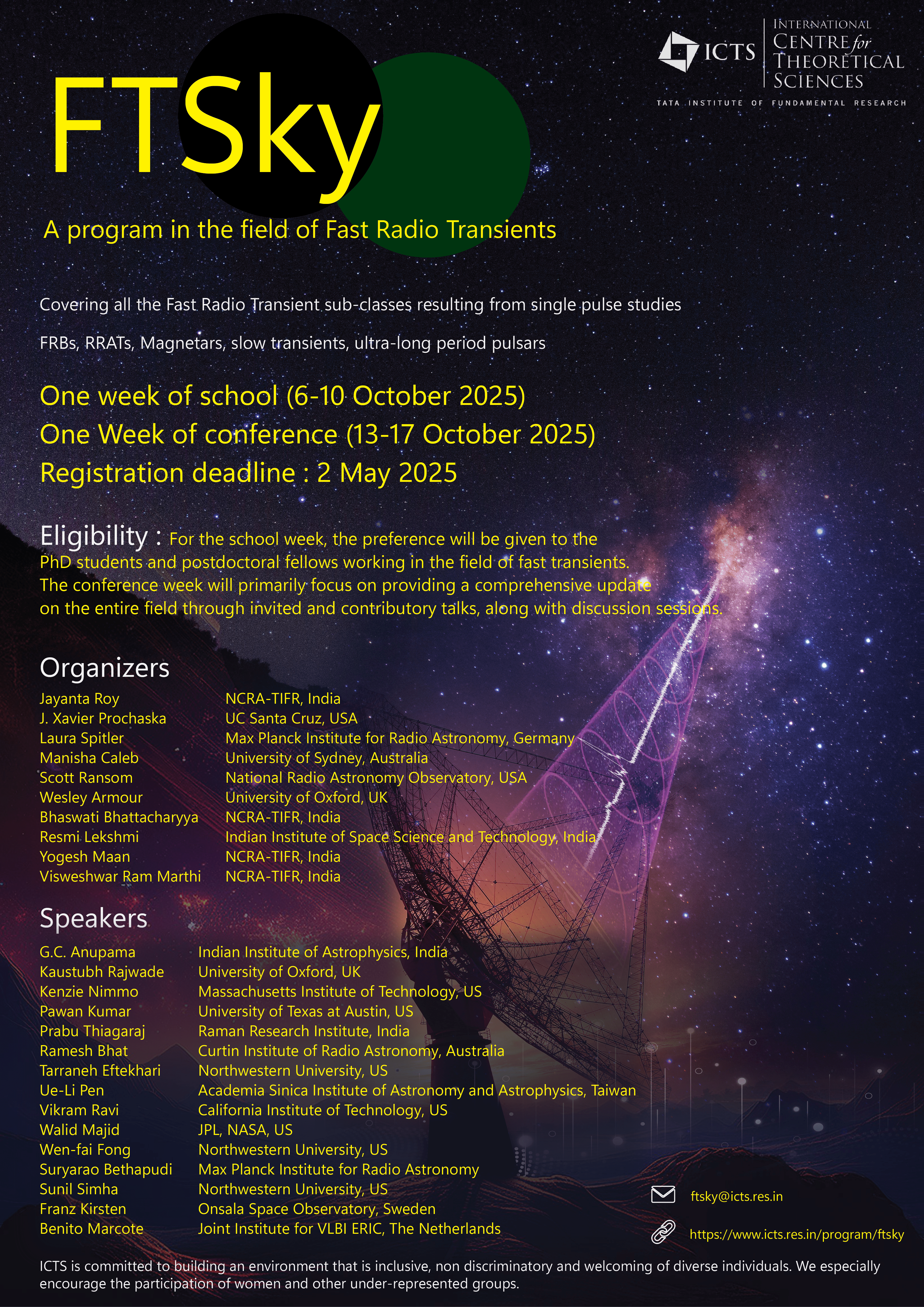We are excited to announce the Fast Radio Transient Sky (FTSky) 2025 program, which will take place from October 6–17 on the dynamic ICTS campus in Bengaluru. FTSky program is a pioneering astrophysics meeting in India focused on the rapidly evolving field of fast radio transients.  The FTSky Training school activities (6-10 October)  are designed to train the next generation of time-domain astronomers, equipping them with all the necessary skills and knowledge to perform fast transient studies in multiple wavelengths, from radio to optical. The workshop week (13-17 October) program provides a unique opportunity to discuss recent updates and results from all sources within the population of Fast Radio Transients in the Universe, with the aim of relating them to FRB progenitor theories and emission mechanisms.