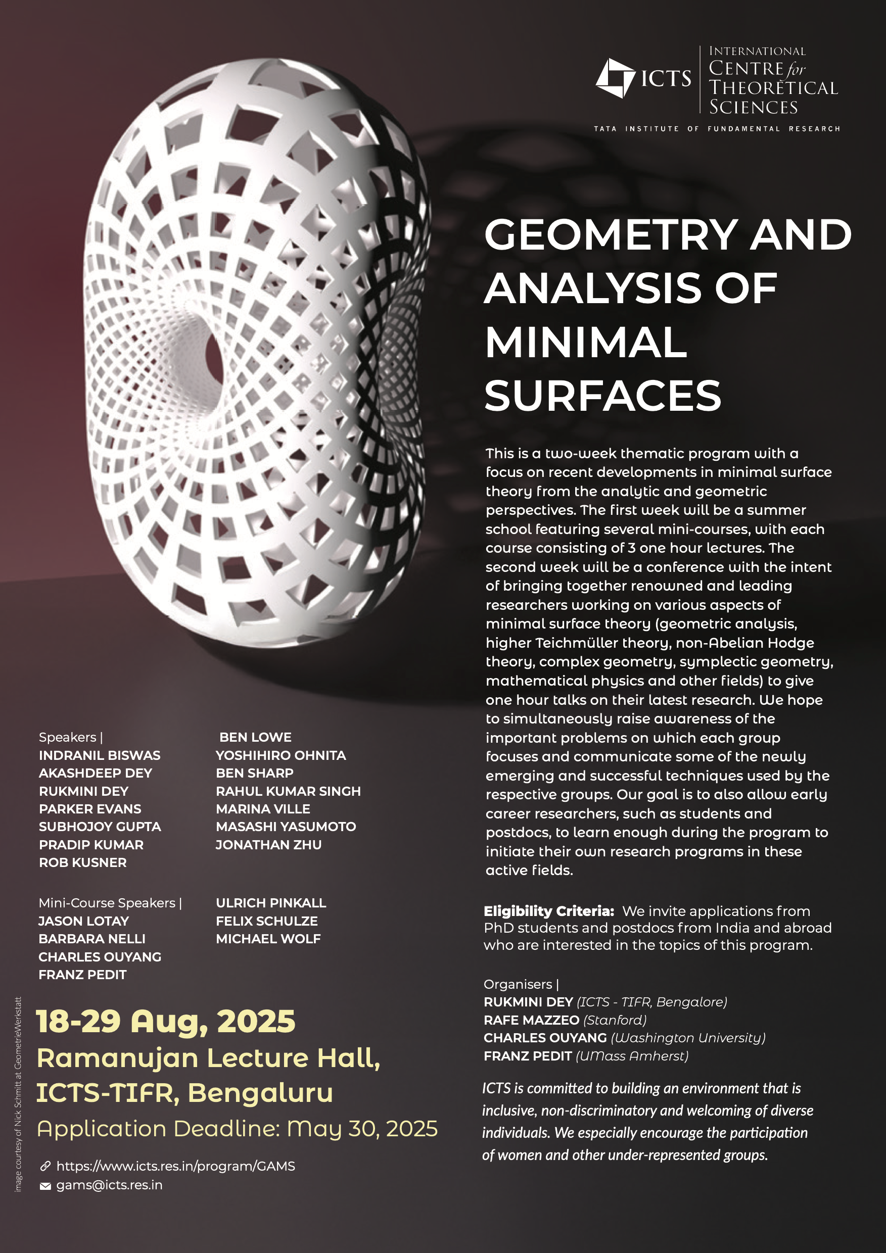 Minimal surfaces play an important role in a number of areas in mathematics, including geometry, topology, complex analysis, PDE, Lie theory, algebraic geometry and mathematical physics. There are also applications to architecture, biology, and material science. In recent years, there have been significant breakthroughs in the theory, both in the understanding of minimal surfaces and in the construction of new examples. This program focuses on geometric and analytic aspects of minimal surfaces, bringing together practitioners of these two perspectives.