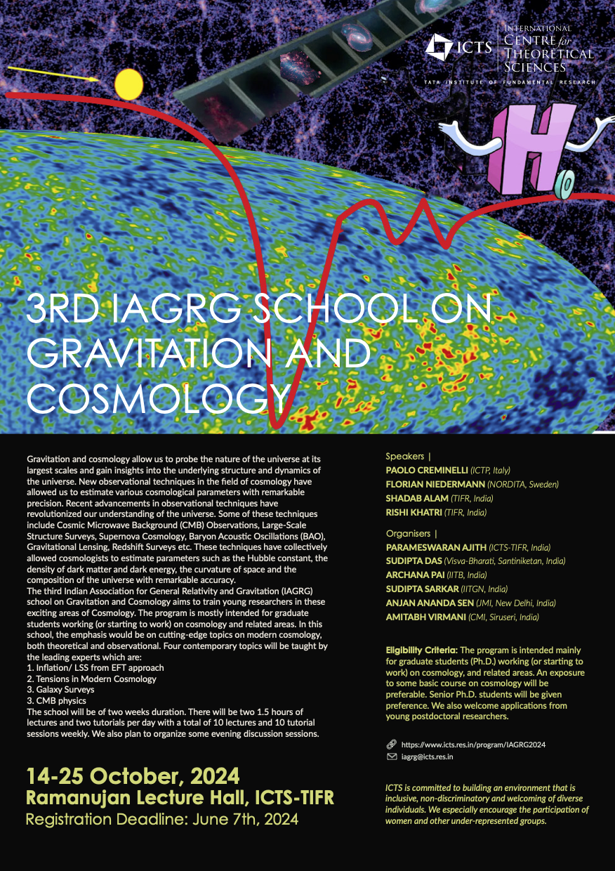 Eligiblity criteria: The program is intended mainly for graduate students (Ph.D.) working (or starting to work) on cosmology, and related areas. An exposure to some basic course on cosmology will be preferable. Senior Ph.D. students will be given preference. We also welcome applications from young postdoctoral researchers.