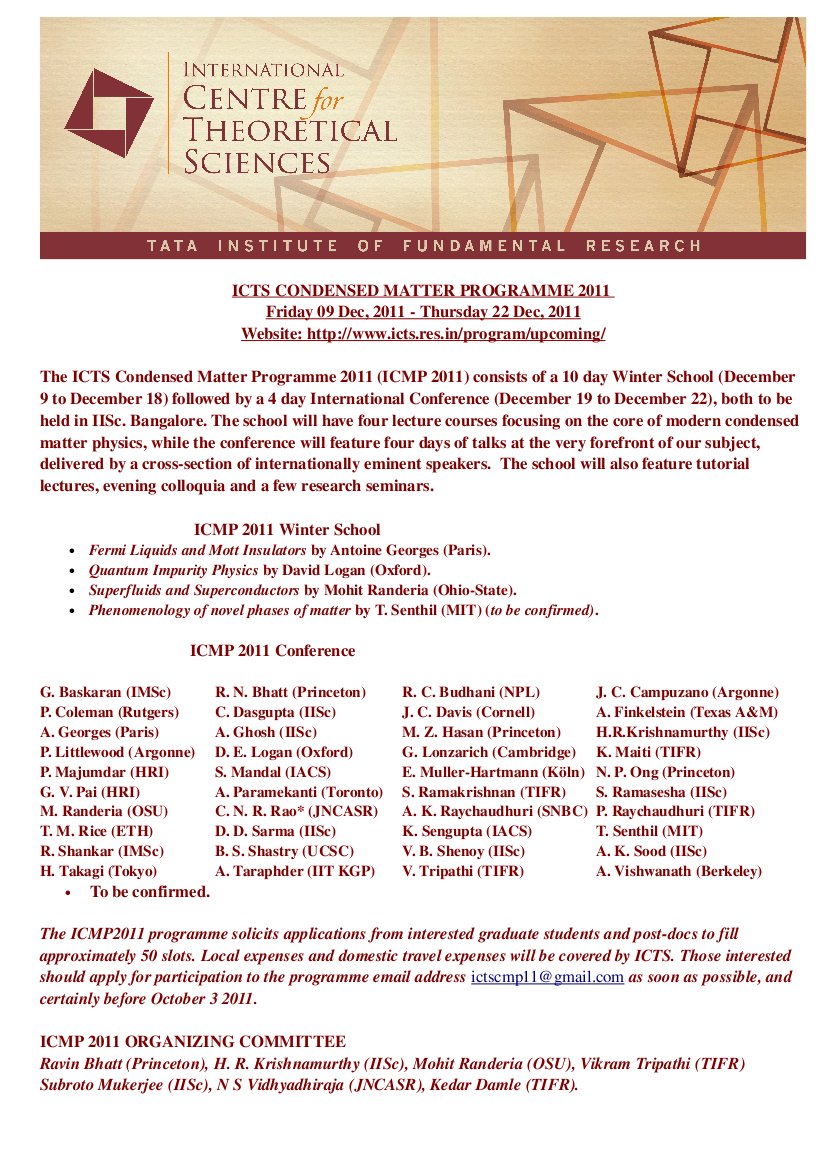 The ICTS Condensed Matter Programme 2011 (ICMP 2011) consists of a 10 day Winter School (December 9 to December 18) followed by a 4 day International Conference (December 19 to December 22), both to be held in IISc. Bangalore. The school will have four lecture courses focusing on the core of modern condensed matter physics, while the conference will feature four days of talks at the very forefront of our subject, delivered by a cross-section of internationally eminent speakers. The school will also feature tutorial lectures, evening colloquia and a few research seminars.
