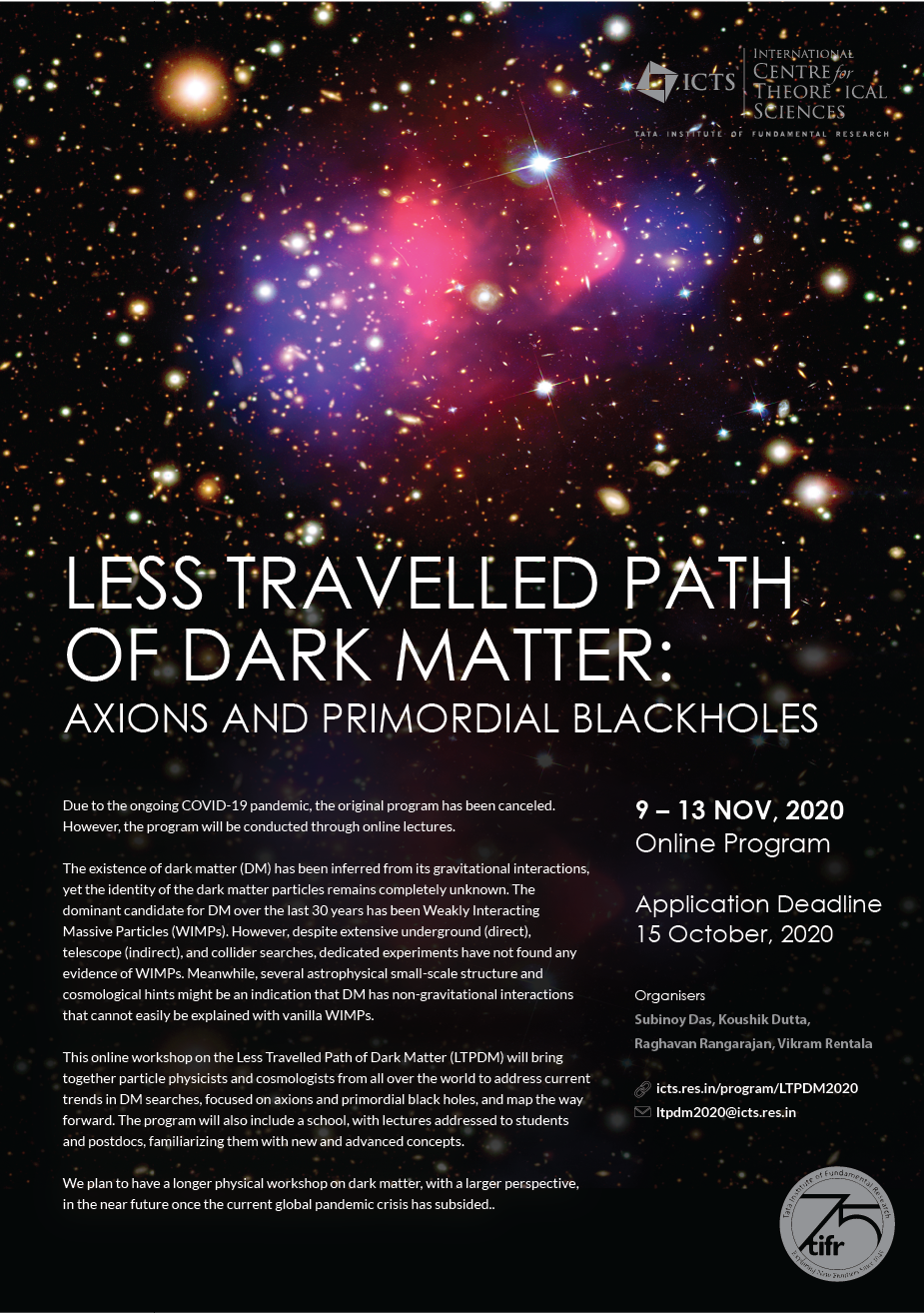 This online workshop on the Less Travelled Path of Dark Matter (LTPDM) will bring together particle physicists and cosmologists from all over the world to address current trends in DM searches, focused on axions and primordial black holes, and map the way forward. The program will also include a school, with lectures addressed to students and postdocs, familiarizing them with new and advanced concepts.