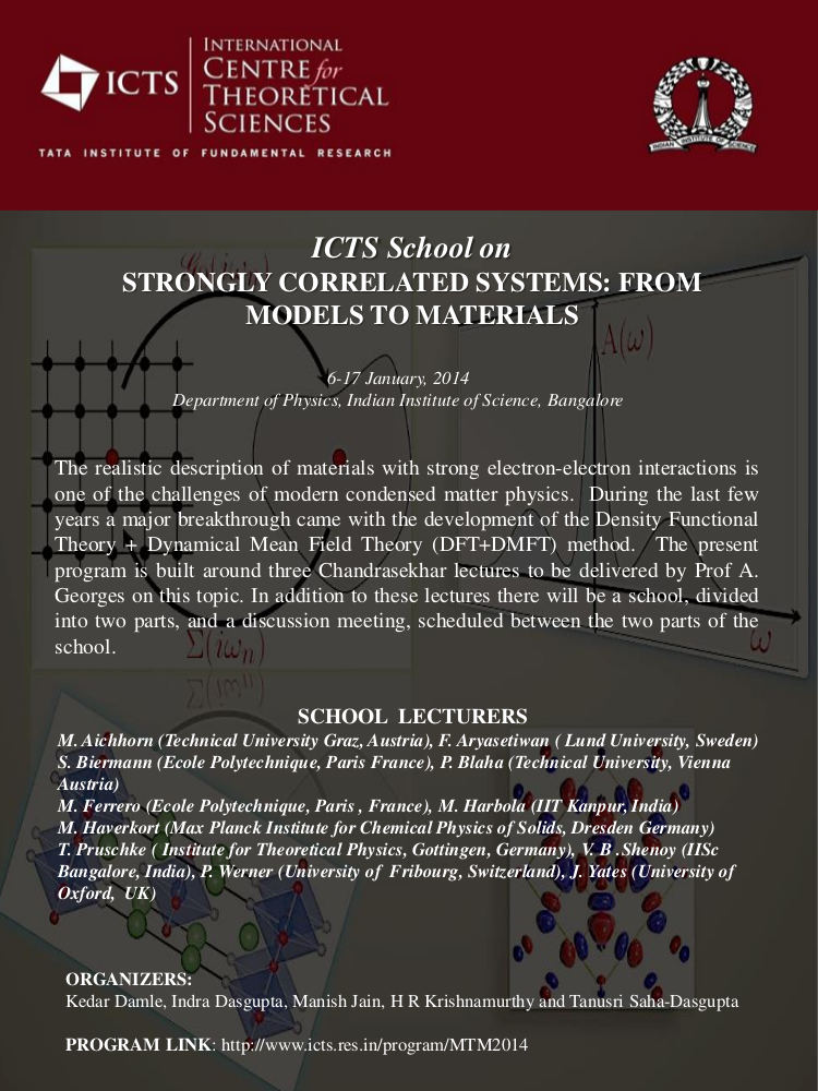 The present program has this circle of ideas as its focus. It is built around three Chandrasekhar lectures to be delivered by Prof A. Georges. In addition to these lectures there will be a school, divided into two parts, and a discussion meeting, scheduled between the two parts of the school, in which recent theoretical and experimental results on strongly correlated materials will be discussed by leading experts from India and abroad.