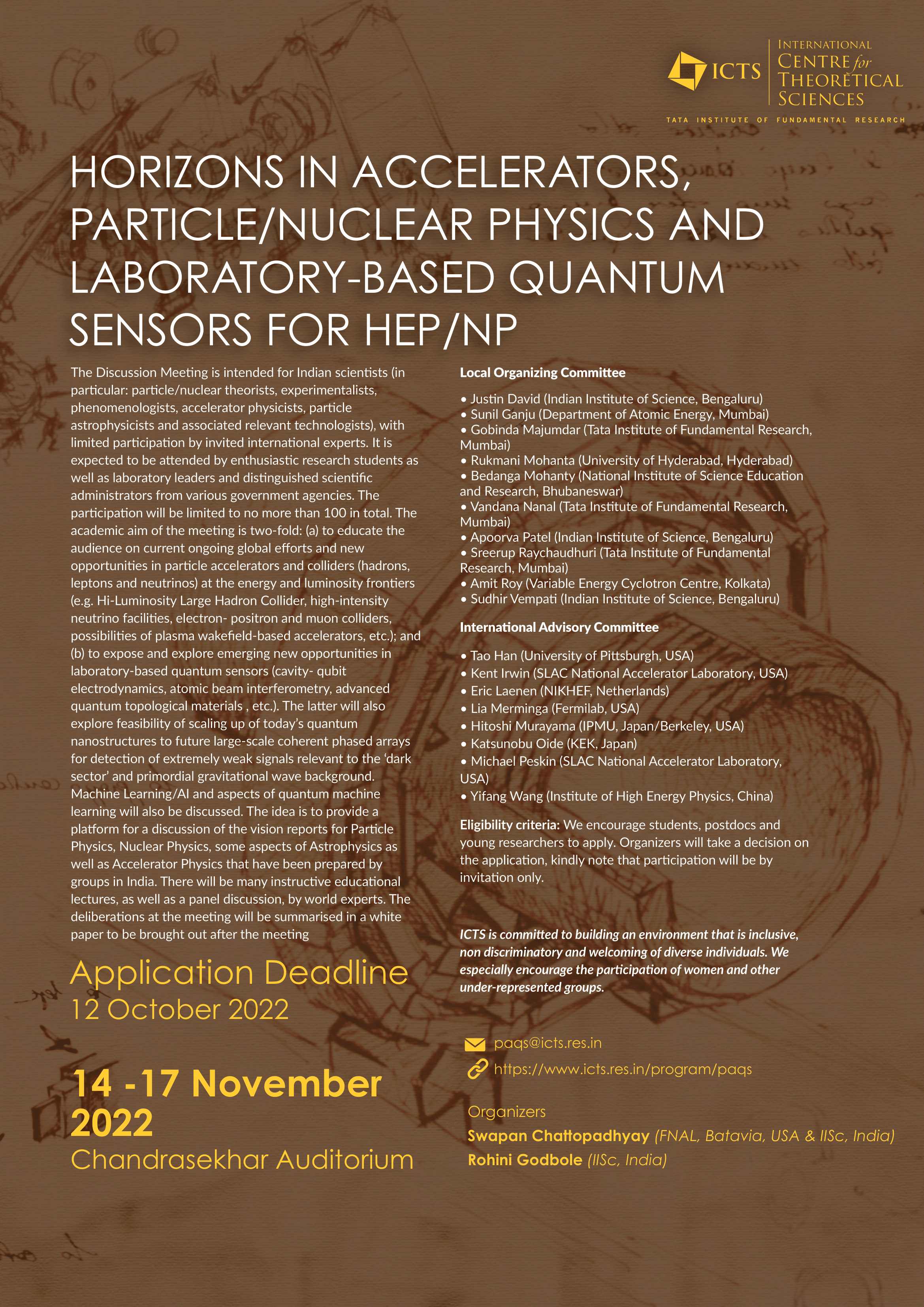 The Discussion Meeting is intended for Indian scientists (in particular: particle/nuclear theorists, experimentalists, phenomenologists, accelerator physicists, particle astrophysicists and associated relevant technologists), with limited participation by invited international experts. It is expected to be attended by enthusiastic research students as well as laboratory leaders and distinguished scientific administrators from various government agencies. The participation will be limited to no more than 100 in total. The academic aim of the meeting is two-fold: (a) to educate the audience on current ongoing global efforts and new opportunities in particle accelerators and colliders (hadrons, leptons and neutrinos) at the energy and luminosity frontiers (e.g. Hi-Luminosity Large Hadron Collider, high-intensity neutrino facilities, electron- positron and muon colliders, possibilities of plasma wakefield-based accelerators, etc.); and (b) to expose and explore emerging new opportunities in laboratory-based quantum sensors (cavity- qubit electrodynamics, atomic beam interferometry, advanced quantum topological materials , etc.). The latter will also explore feasibility of scaling up of today’s quantum nanostructures to future large-scale coherent phased arrays for detection of extremely weak signals relevant to the ‘dark sector’ and primordial gravitational wave background. Machine Learning/AI and aspects of quantum machine learning will also be discussed. The idea is to provide a platform for a discussion of the vision reports for Particle Physics, Nuclear Physics, some aspects of Astrophysics as well as Accelerator Physics that have been prepared by groups in India. There will be many instructive educational lectures, as well as a panel discussion, by world experts. The deliberations at the meeting will be summarised in a white paper to be brought out after the meeting.
