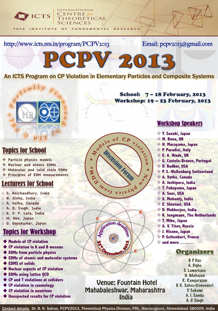 In the contemporary era of the Large Hadron Collider (LHC) in which physicists worldwide are hoping to find answers to many outstanding questions of particle physics, complementary attempts to look for new physics via non-accelerator probes are very significant. The field of CP violation is vast and is growing rapidly and independently in different research areas. It interconnects many areas such as particle, nuclear, atomic, molecular and solid state physics and involves experimental, theoretical and computational methods. This ICTS program on CP violation (PCPV 2013) will bring together practitioners from such diverse fields as particle, nuclear and atomic physics, both experimental and theoretical, who have an interest in CP violation, on a single platform.