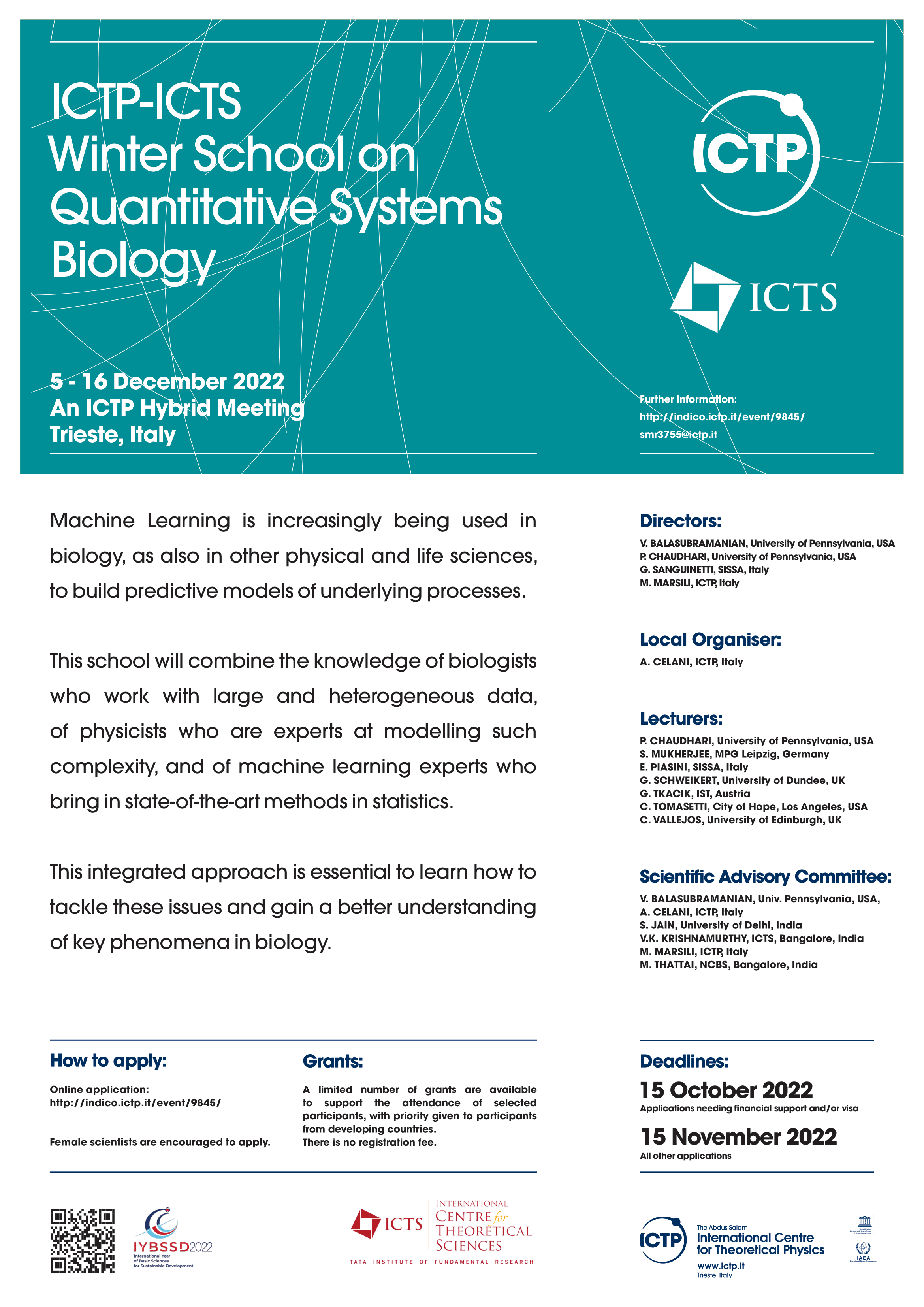 The Winter School on Quantitative System Biology has been held every year since 2012 at ICTP in Trieste, Italy and ICTS in Bangalore, India in alternating years.