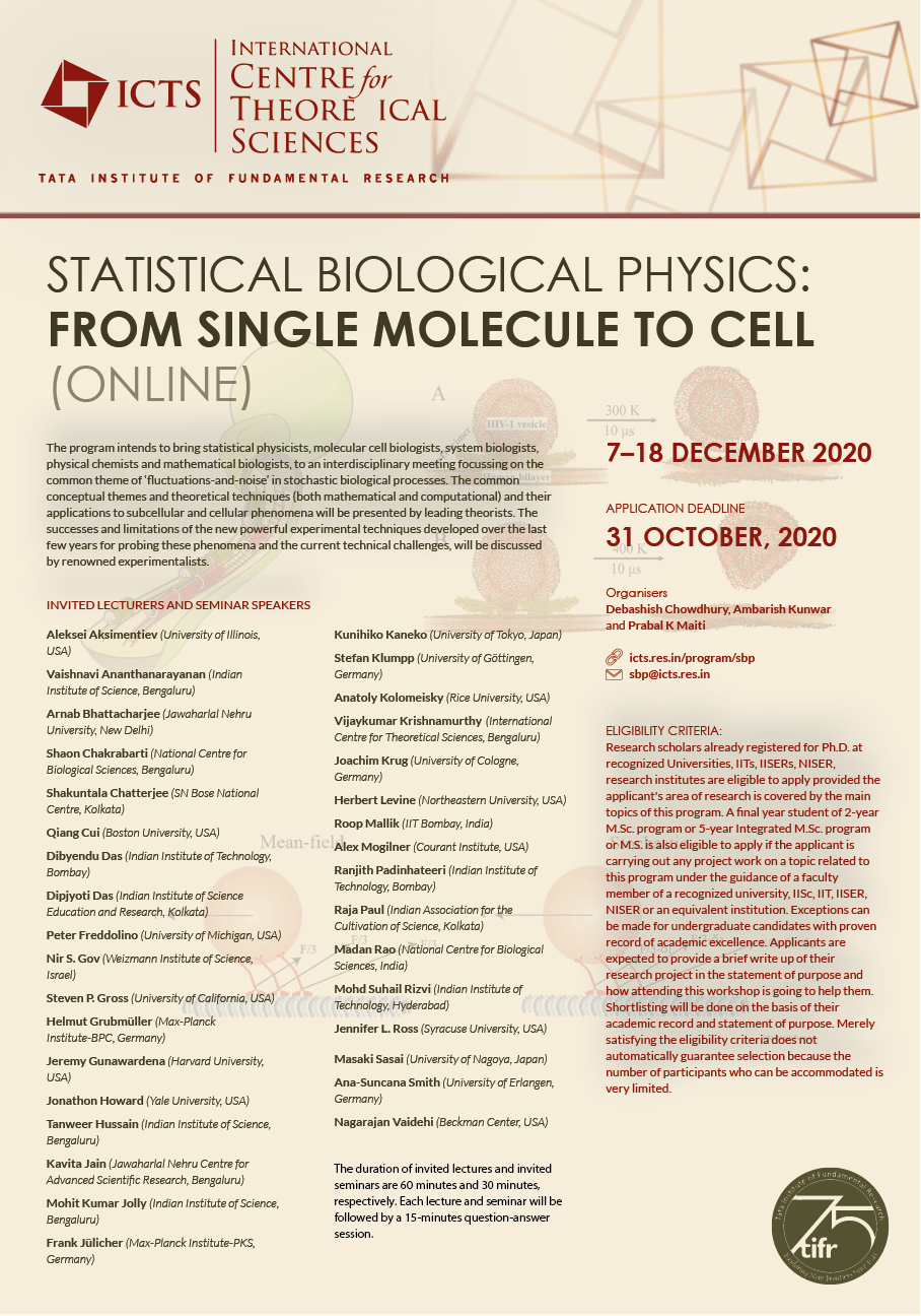 The ICTS program 'Statistical Biological Physics: From Single Molecule to Cell' intends to bring statistical physicists, molecular cell biologists, system biologists, physical chemists and mathematical biologists, to an interdisciplinary meeting focussing on the common theme of 'fluctuations-and-noise' in stochastic biological processes. The common conceptual themes and theoretical techniques (both mathematical and computational) and their applications to subcellular and cellular phenomena will be presented by leading theorists. The successes and limitations of the new powerful experimental techniques developed over the last few years for probing these phenomena and the current technical challenges, will be discussed by renowned experimentalists.