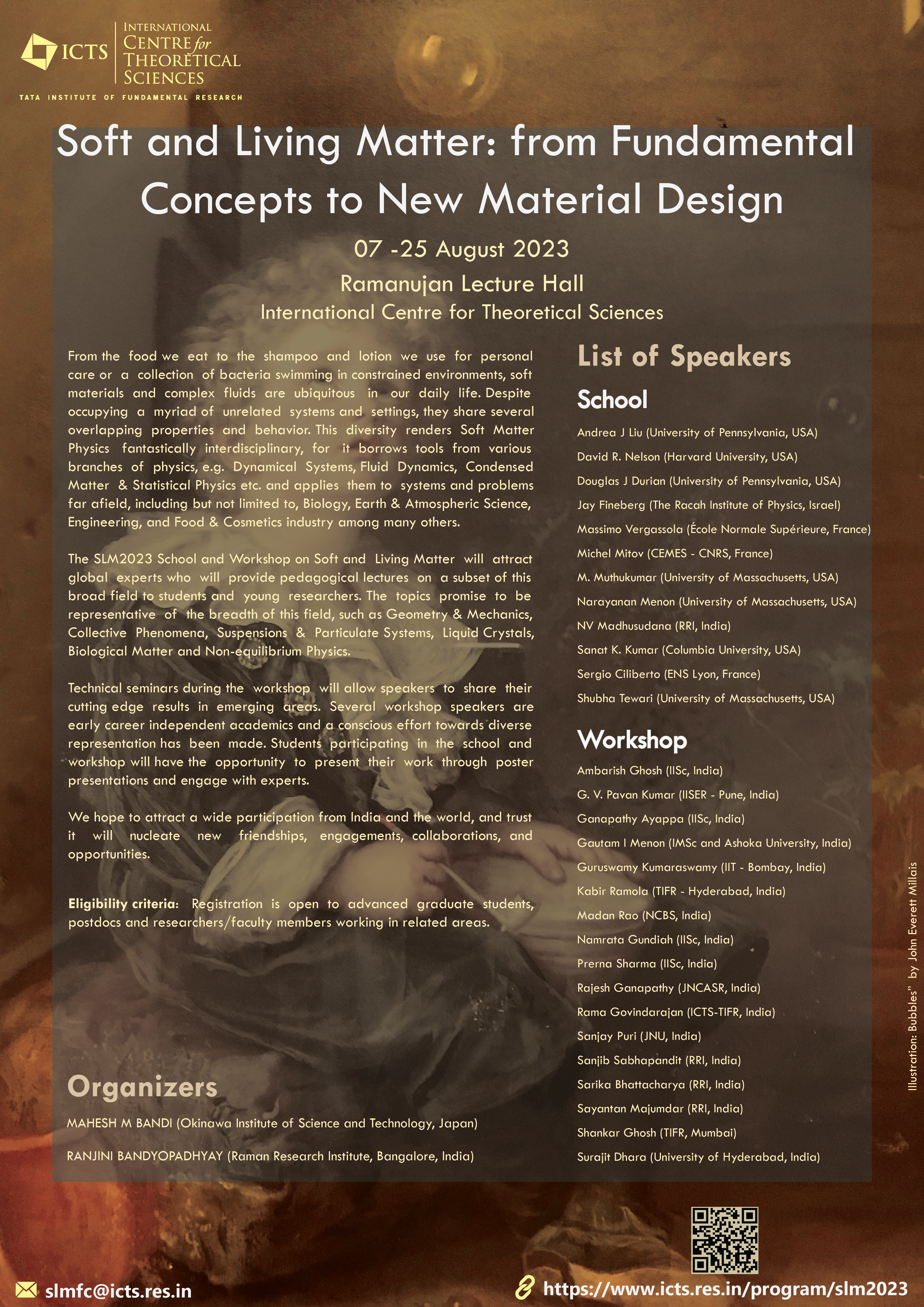 The SLM2023 School and Workshop on Soft and Living Matter will attract global experts who will provide pedagogical lectures on a subset of this broad field to students and young researchers. The topics promise to be representative of the breadth of this field, such as Geometry & Mechanics, Collective Phenomena, Suspensions & Particulate Systems, Liquid Crystals, Biological Matter and Non-equilibrium Physics.