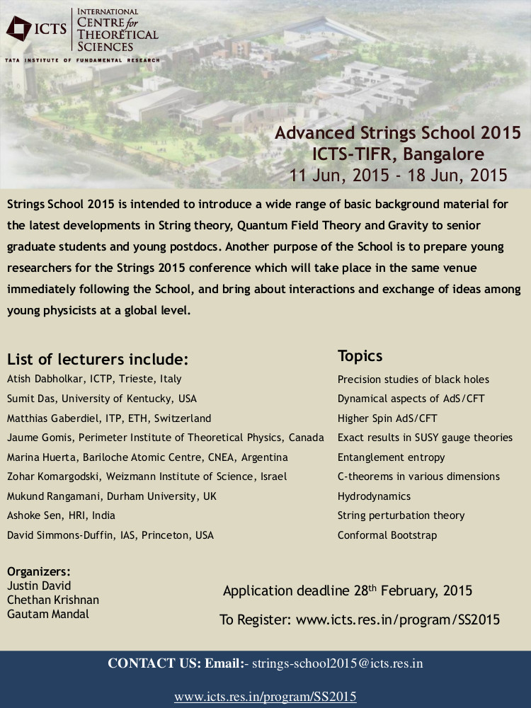 Strings School 2015 is intended to introduce a wide range of basic background material for the latest developments in String theory, Quantum Field Theory and Gravity to senior graduate students and young postdocs. Another purpose of the School is to prepare young researchers for the Strings 2015 conference which will take place in the same venue immediately following the School, and bring about interactions and exchange of ideas among young physicists at a global level.