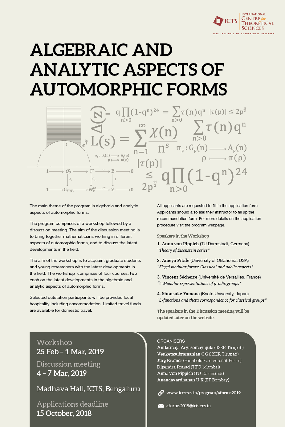 Modular forms occur in many facets in even more different areas of mathematics. Beginning with classical aspects of these marvellous functions these lectures will introduce multiple Eisenstein series and their linkage to the theory of multiple zeta values and their q-analogues. - Prof. Ameya Pitale (University of Oklahoma, USA): “Siegel modular forms: Classical and adelic aspects”.