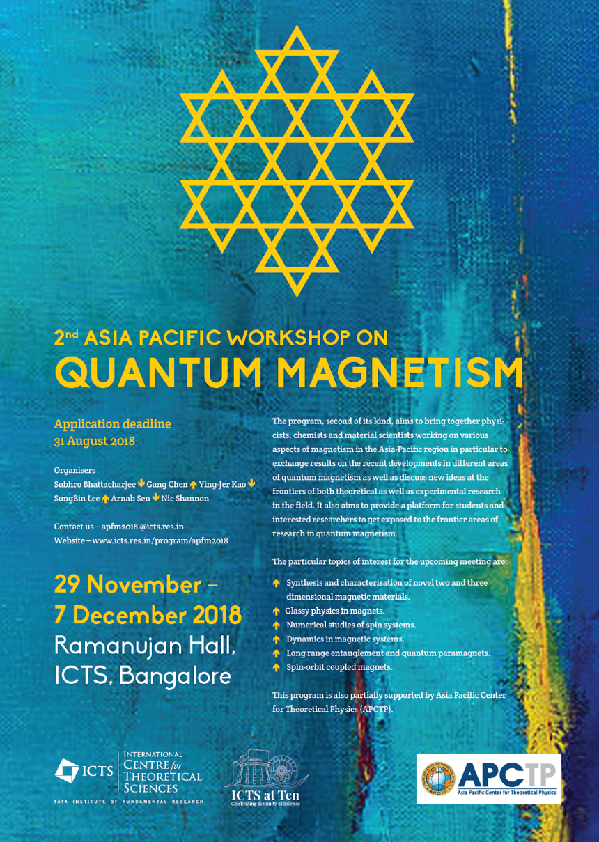 The program, second of its kind, aims to bring together physicists, chemists and material scientists working on various aspects of magnetism in the Asia-Pacific region in particular to exchange results on the recent developments in different areas of quantum magnetism as well as discuss new ideas at the frontiers of both theoretical as well as experimental research in the field. It also aims to provide a platform for students and interested researchers to get exposed to the frontier areas of research in quantum magnetism.
