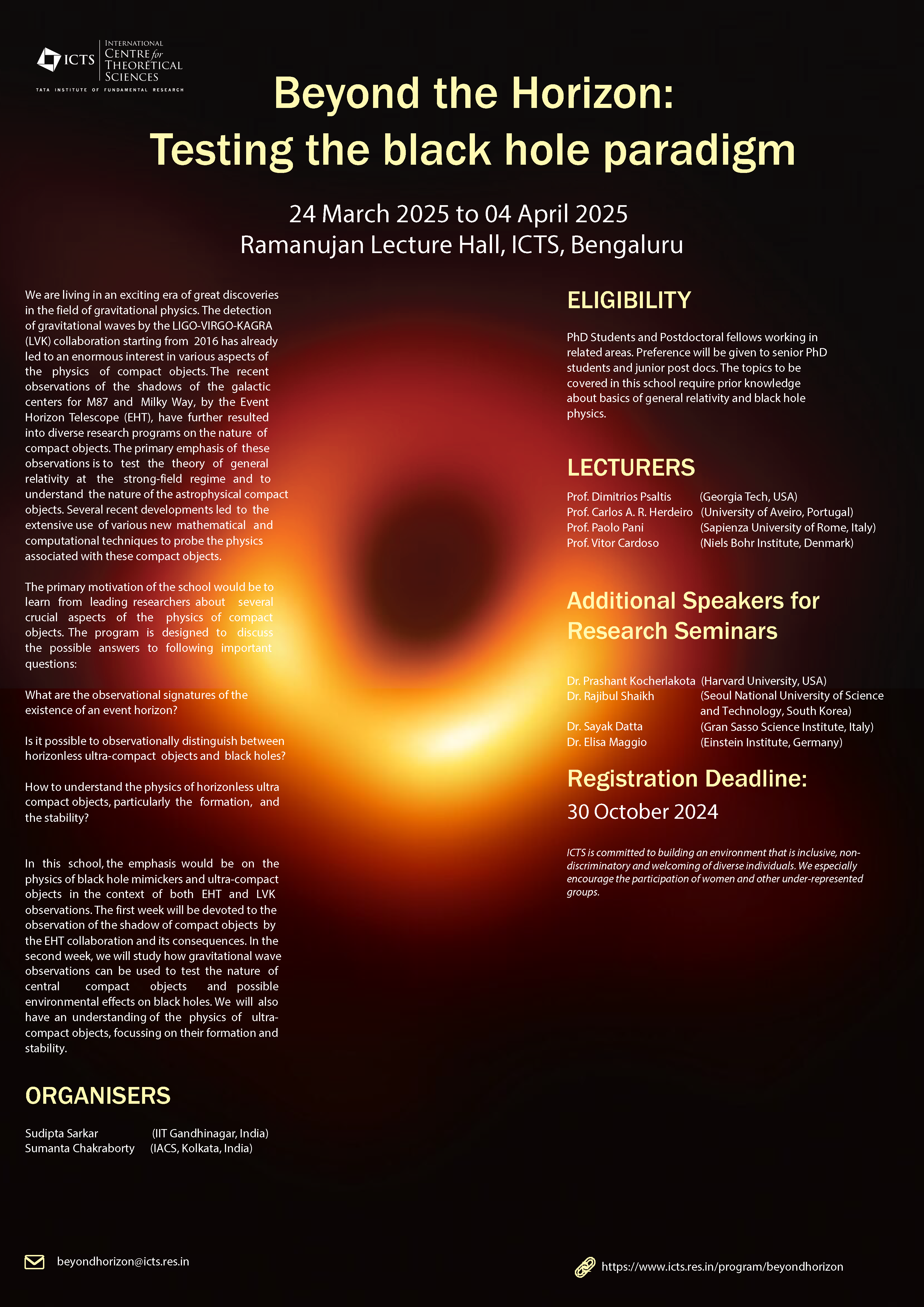 Eligibility criteria: PhD Students and Postdoctoral fellows working in related areas. Preference will be given to senior PhD students and junior post docs. The topics to be covered in this school require prior knowledge about basics of general relativity and black hole physics.