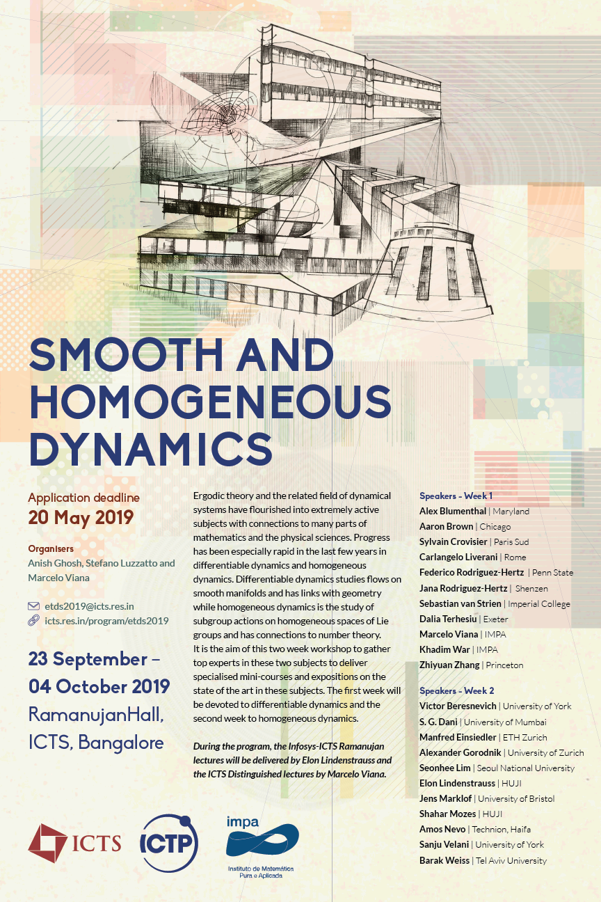 During the program, the Infosys-ICTS Ramanujan lectures will be delivered by Prof. Elon Lindenstrauss and the ICTS Distinguished lectures by Prof. Marcelo Viana.