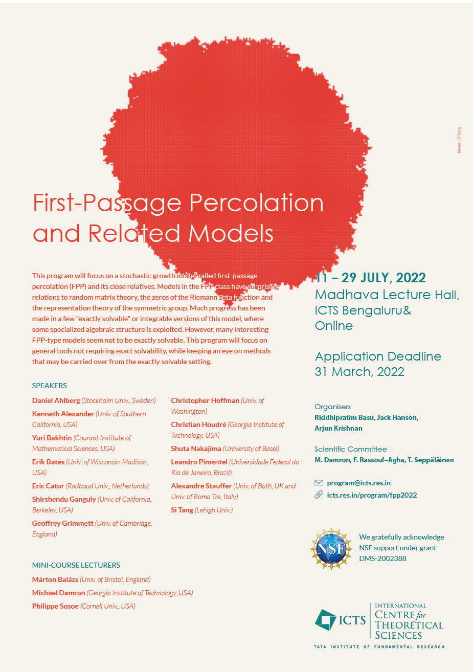 This program will focus on the model of first-passage percolation (FPP) --- a stochastic growth model --- and its close relatives. Stochastic growth models arise from physics and biology, and have been studied since the 1960s. Such systems address the behavior of growing interfaces, the spread of bacterial colonies, and the fluctuations of long chemical chains in a random potential.