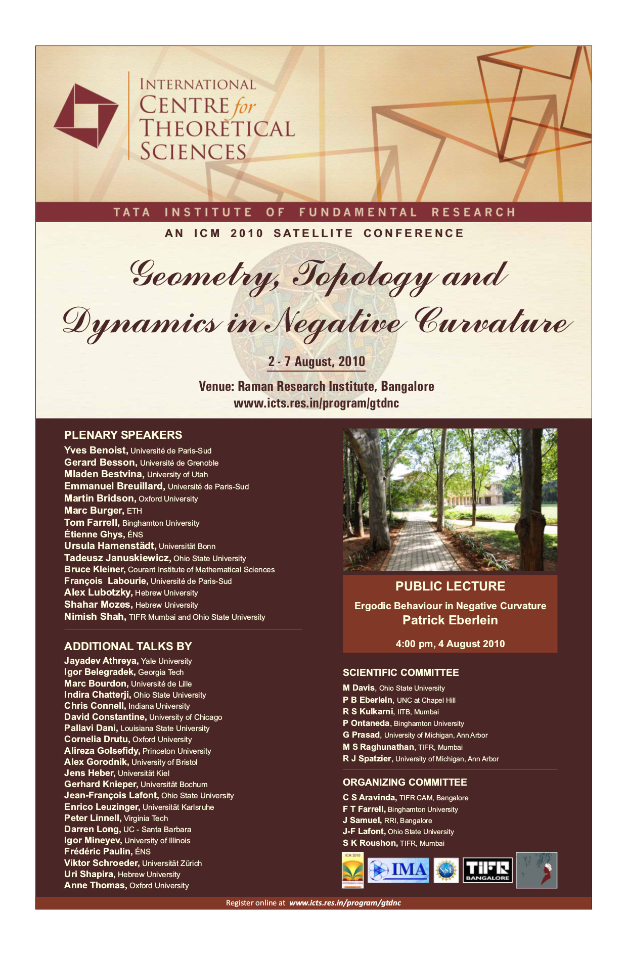 Scientific Committee: M. Davis (OSU at Columbus, USA), P. B. Eberlein (UNC at Chapel Hill, USA), R. S. Kulkarni (IITB, Mumbai, India), P. Ontaneda (SUNY at Binghamton, USA), G. Prasad (University of Michigan, Ann Arbor, USA), M. S. Raghunathan (TIFR, Mumbai, India), R. Spatzier (University of Michigan, Ann Arbor, USA)