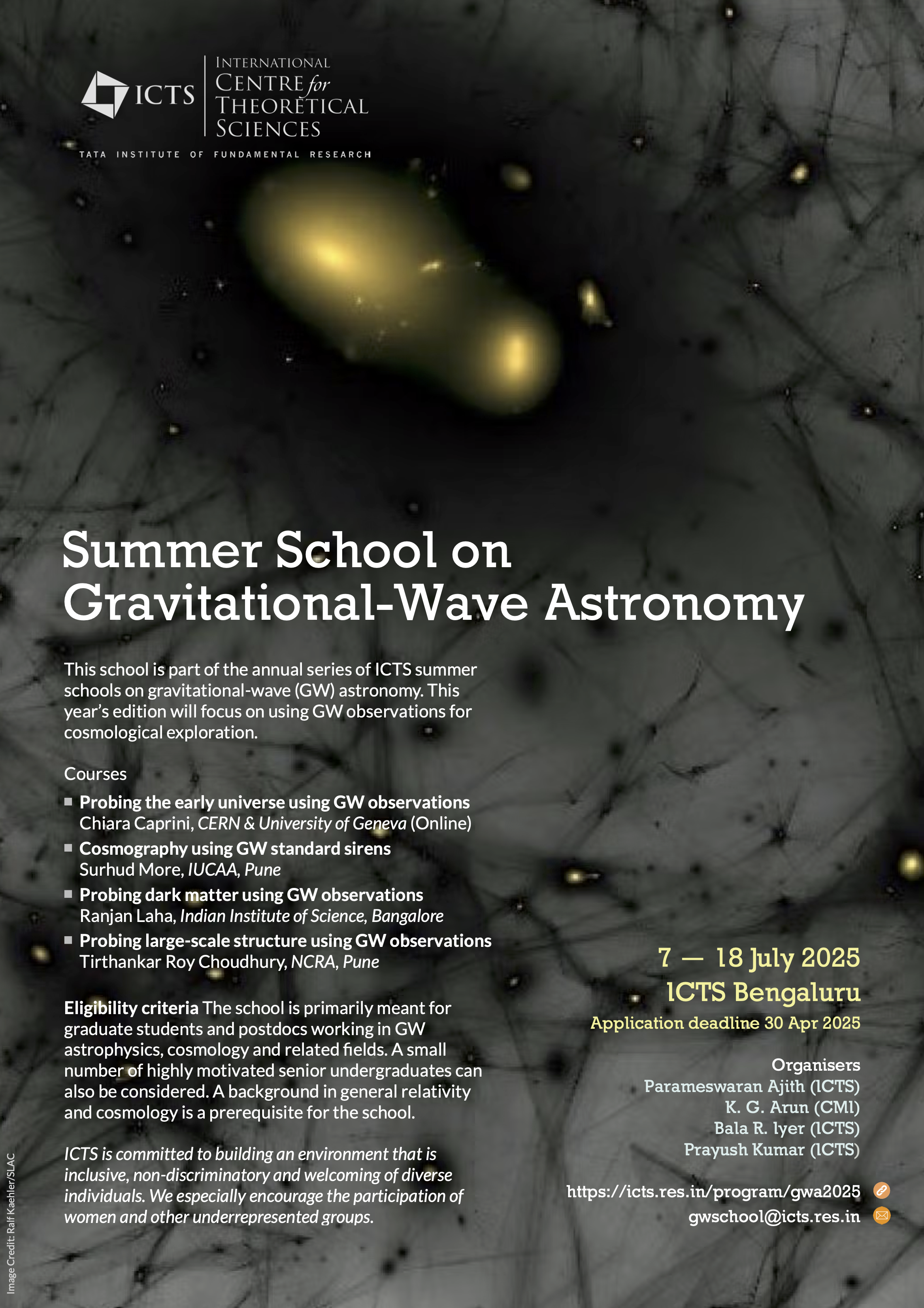 Eligibility criteria: The school is primarily meant for graduate students and postdocs working in GW astrophysics, cosmology and related fields. A small number of highly motivated senior undergraduates can also be considered. A background in general relativity and cosmology is a prerequisite for the school.