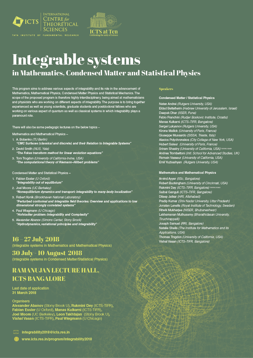 The above two divisions are only made just as a broad reference for gathering like-minded mathematicians and physicists. But, we aim to strongly encourage cross-disciplinary discussions throughout the 4 week program under the common theme of integrability.